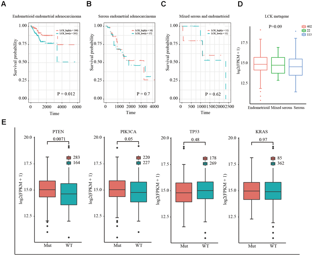 Next, we downloaded the somatic mutation data for PTEN, PIK3CA, TP53, and KRAS, which are commonly mutated genes in EC, and divided the patients into mutant and wild-type groups. The expression of LCK in the PTEN, PIK3CA, TP53, and KRAS groups and difference between the mutant and wild-type groups were assessed. The results showed that LCK metagene expression was higher in the PTEN and PIK3CA mutant groups than in the wild-type group, with no significant difference in LCK metagene expression between the TP53 and KRAS mutant and wild-type groups (Figure 2E).