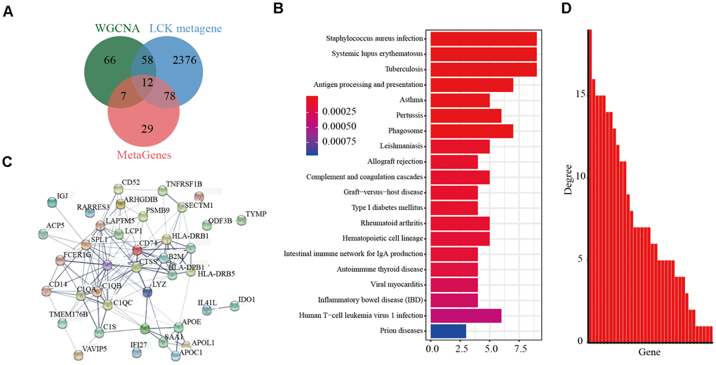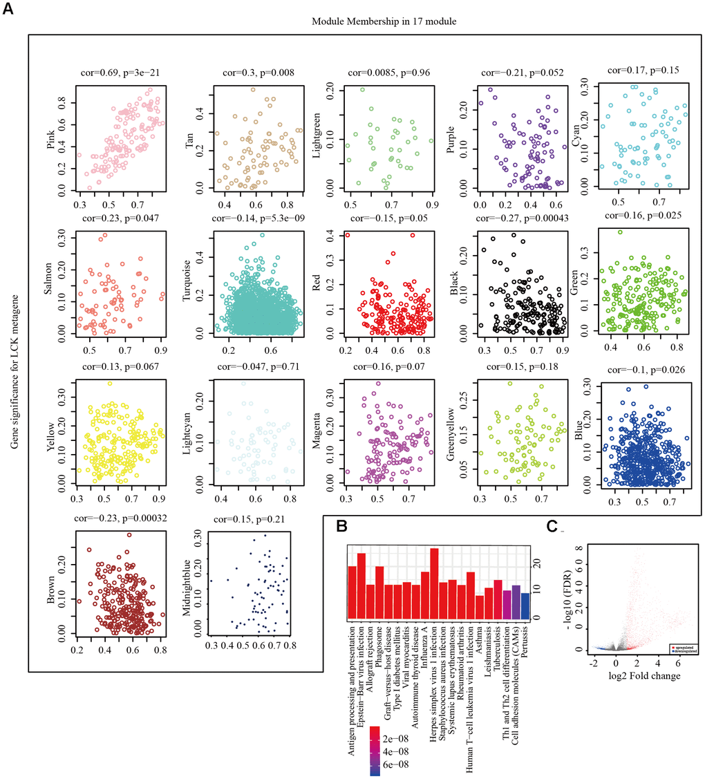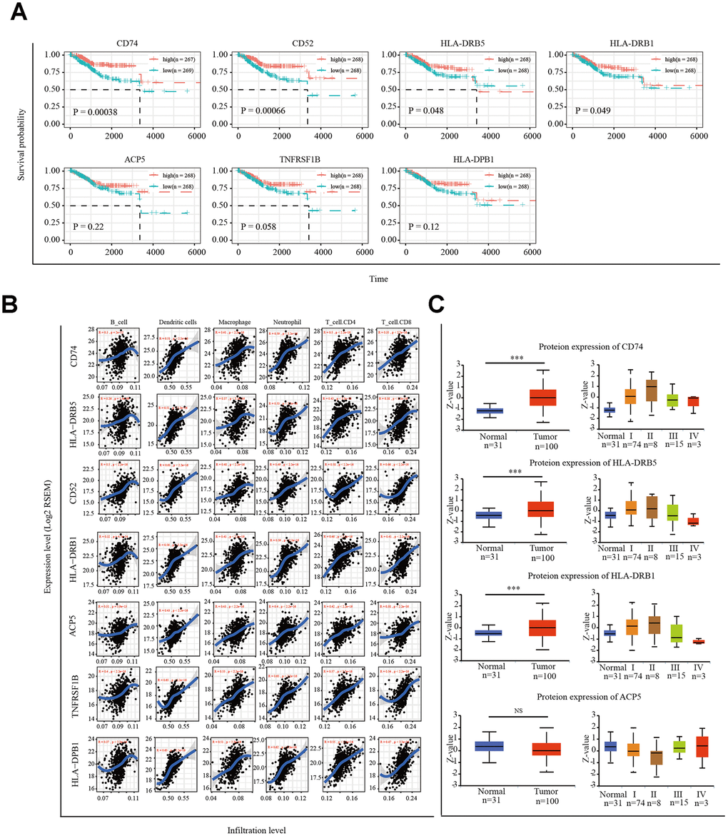 Next, we used the LCK metagene members as the core object and performed WGCNA to detect representative genes from LCK-related gene modules and constructed a weighted co-expression network. We also analyzed the DEGs between samples with high and low LCK metagene scores to identify co-expressed genes whose mRNA levels were significantly correlated with LCK metagenes. By evaluating the overlap between co-expressed genes significantly related to LCK and exploring the functions of these genes through enrichment analysis, we found multiple enriched immune-related GO terms, particularly the T cell receptor signaling pathway and T cell activation. Survival analysis and prediction revealed seven potential immune-related diagnostic and prognostic markers. These included CD74, HLA-DRB5, CD52, HLA-DPB1, HLA-DRB1, TNFRSF1B, and ACP5. We used the TIMER algorithm to calculate the correlation between the expression of these seven genes and degree of infiltration of CD4+ T cells, CD8+ T cells, B cells, neutrophils, macrophages, and dendritic cells. All genes were significantly positively correlated with cellular infiltration.