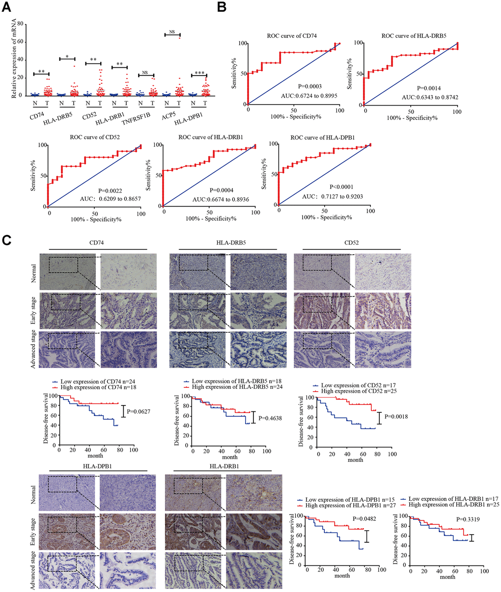 Next, we detected the mRNA expression of CD74, HLA-DRB5, CD52, HLA-DPB1, HLA-DRB1, TNFRSF1B, and ACP5 in 41 EC tissues and 20 normal endometrial tissues by real-time PCR. The results showed that the expression levels of CD74, HLA-DRB5, CD52, HLA-DPB1, HLA-DRB1 were higher in EC tissues than in normal endometrial tissues (Figure 6A). Receiver operating characteristic (ROC) curve analysis was performed, and the correlation area under the curve was used to confirm the diagnostic efficacy of the gene expression levels (Figure 6B). The results suggest that CD74, HLA-DRB5, CD52, HLA-DPB1 and HLA-DRB1 expression levels can discriminate between EC and normal endometrial tissue. Furthermore, CD74, HLA-DRB5, CD52, HLA-DPB1 and HLA-DRB1 protein expression levels were detected by immunohistochemistry in 42 EC tissues and 20 normal endometrial tissues. The results showed that the high expression rate of CD74 protein expression in early-stage EC was 54.5%, which was higher than that of in normal endometrial tissue (20%, P = 0.0289). The high expression rate of HLA-DRB5 protein expression in early-stage EC was 59.1%, which was higher than that of in normal endometrial tissue (25%, P = 0.0334). The high expression rate of CD52 protein expression in early-stage EC was 63.6%, which was higher than that of in normal endometrial tissue (25%, P = 0.0157). The high expression rate of HLA-DPB1 protein expression in early-stage EC was 54.5%, which was higher than that of in normal endometrial tissue (20%, P = 0.0068). The high expression rate of HLA-DRB1 protein expression in early-stage EC was 72.2%, which was higher than that of in normal endometrial tissue (40%, P = 0.0124). These five proteins were highly expressed in early-stage EC tissues compared to in normal endometrial tissue. In advanced EC tissues, there was not significant difference in the high expression rate of these five proteins compared to in normal tissues. The disease-free survival curves indicated that high expression of CD52 and HLA-DPB1 is correlated with high survival rates in EC (Figure 6C).
