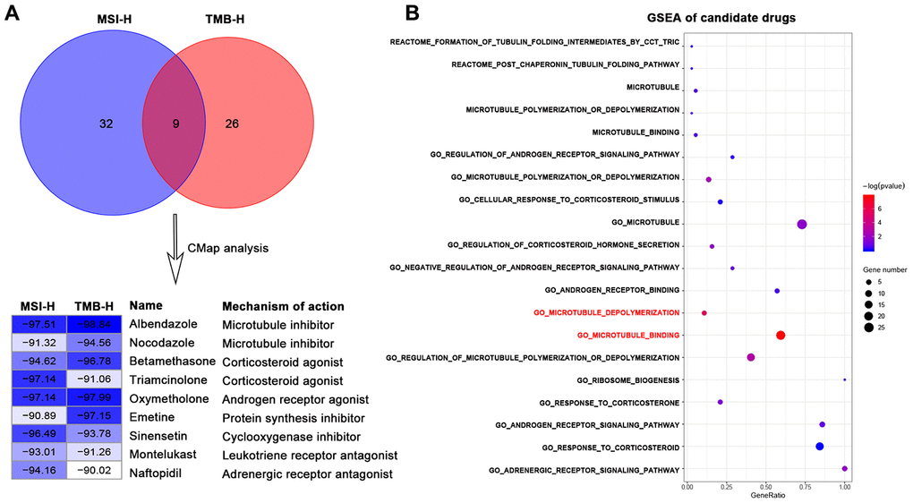 We firstly used DEGs of MSI-H and TMB-H groups to query in the CMap database respectively to repurpose candidate drugs. CMap results revealed nine drugs both from the two groups were significantly negatively correlated with the DEGs (connectivity score <-90). These nine drugs can be classified into seven types (Figure 1A) according to the annotation information of the CMap database and previous studies [18–23].