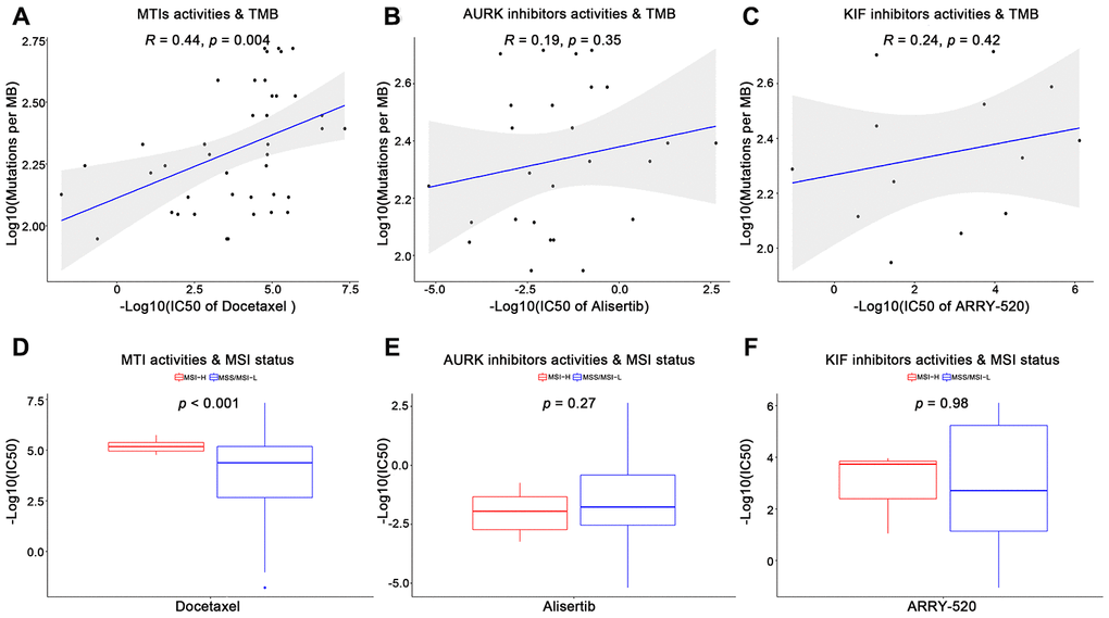 Furthermore, we utilized the genomics of drug sensitivity in cancer (GDSC) database to validate the anticancer sensitivities of MTIs in GC with high immune activity. A total of 13 tubulin related drugs (such as MTIs, AURK inhibitors, and KIF inhibitors) and 26 gastric cancer cells were available in the GDSC database. For the TMB levels and MSI status in GC cell lines, some MTIs showed significant associations with TMB levels (Figure 2A, docetaxel: R = 0.44, p-value = 0.004) and MSI-H (Figure 2D, docetaxel: p-value < 0.001). However, no significance was found in other tubulin related drugs, including AURK inhibitors (Figure 2B, 2E, alisertib: p-values > 0.05) and KIF inhibitors (Figure 2C, 2F, ARRY-520: p-values > 0.05) (complete results were shown in Supplementary Table 2).