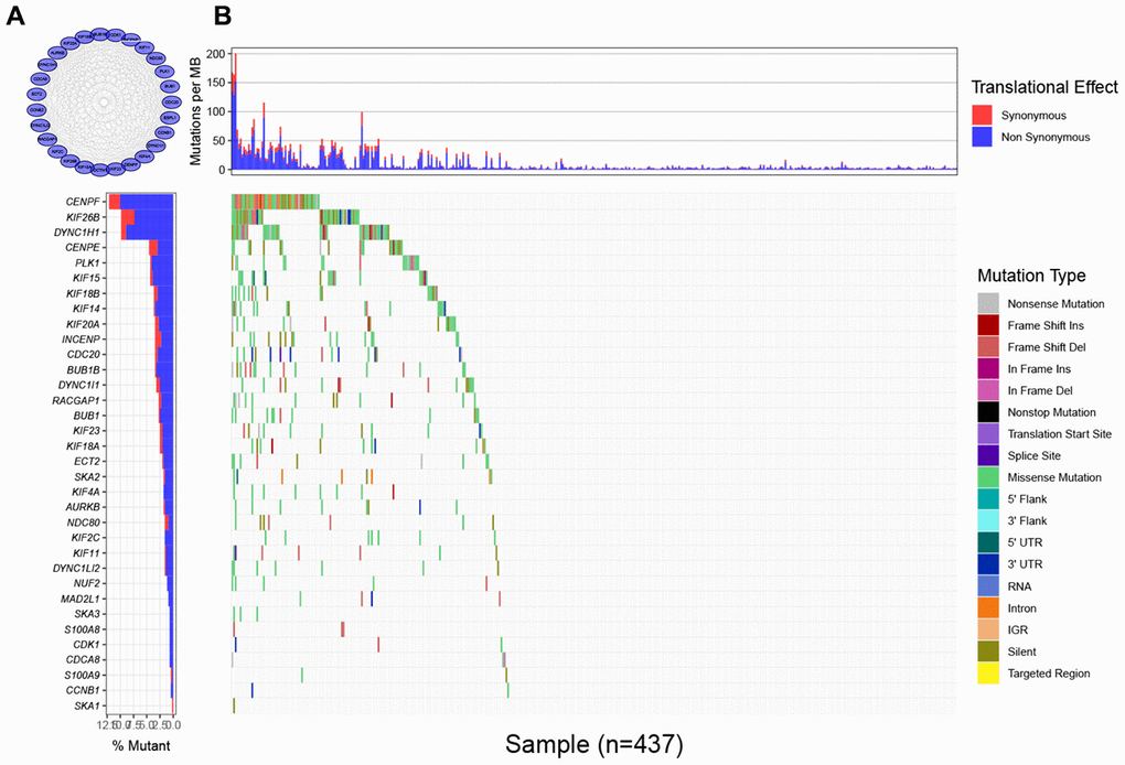 To find the characteristic gene which could suggest the activities of MTIs in GC with high immune activity, we started with a PPI network analysis. Based on the 17 common DEGs directly enriched in the MTIs representative pathways, we constructed a PPI network with 30 nodes and 289 edges (Figure 3A). After that we carried out a mutational landscape analysis on these 30 node genes and revealed that three genes (DYNC1H1, KIF26B, and CENPF) were mutated at a high frequency (mutation frequency ≥ 7%) in the TCGA-STAD cohort (Figure 3B).