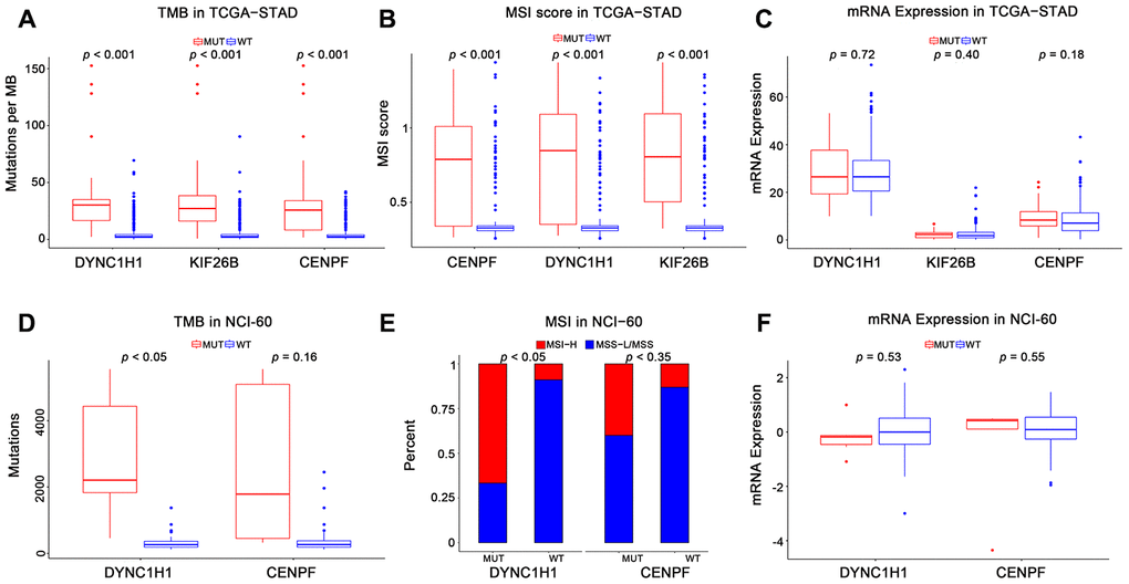 To characterize the roles of these three genes in high immune activity, we separately compared the levels of TMB, MSI score, and mRNA expression between these three genes mutated and wild type tumors based on the TCGA-STAD, NCI-60 cell lines and immunotherapy datasets. As shown in Figure 4 and Supplementary Figure 2, mutations in DYNC1H1 were significantly correlated with TMB-H and MSI-H in these above datasets. Mutations in CENPF were considerably correlated with TMB-H and MSI-H in the TCGA-STAD cohort, but not in the NCI-60 cell lines or immunotherapy dataset. Mutations in KIF26B were significantly correlated with TMB-H and MSI-H in the TCGA-STAD cohort, but not immunotherapy datasets (KIF26B was not detected in NCI-60 cell lines dataset). Besides, there was no significant difference of mRNA expression levels among three genes mutated and wild type tumors in TCGA-STAD or NCI-60 cell lines dataset (Figure 4C, 4F). Together, these results indicated that mutant DYNC1H1 was strongly associated with enhanced tumor immune activity.