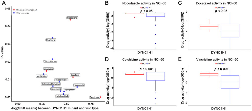 To explore the interaction between mutant DYNC1H1 and MTIs, we firstly selected 41 MTIs included in NCI-60 cell lines dataset. 13 of these MTIs have significantly increased activities in the DYNC1H1 mutated cell lines (Figure 5, p-value < 0.05). Furthermore, a clear trend of higher MTIs activities was observed in DYNC1H1-mutated GC cells (Supplementary Figure 4). These results suggested that mutations in DYNC1H1 may be an essential biomarker for the antitumor effects of MTIs.
