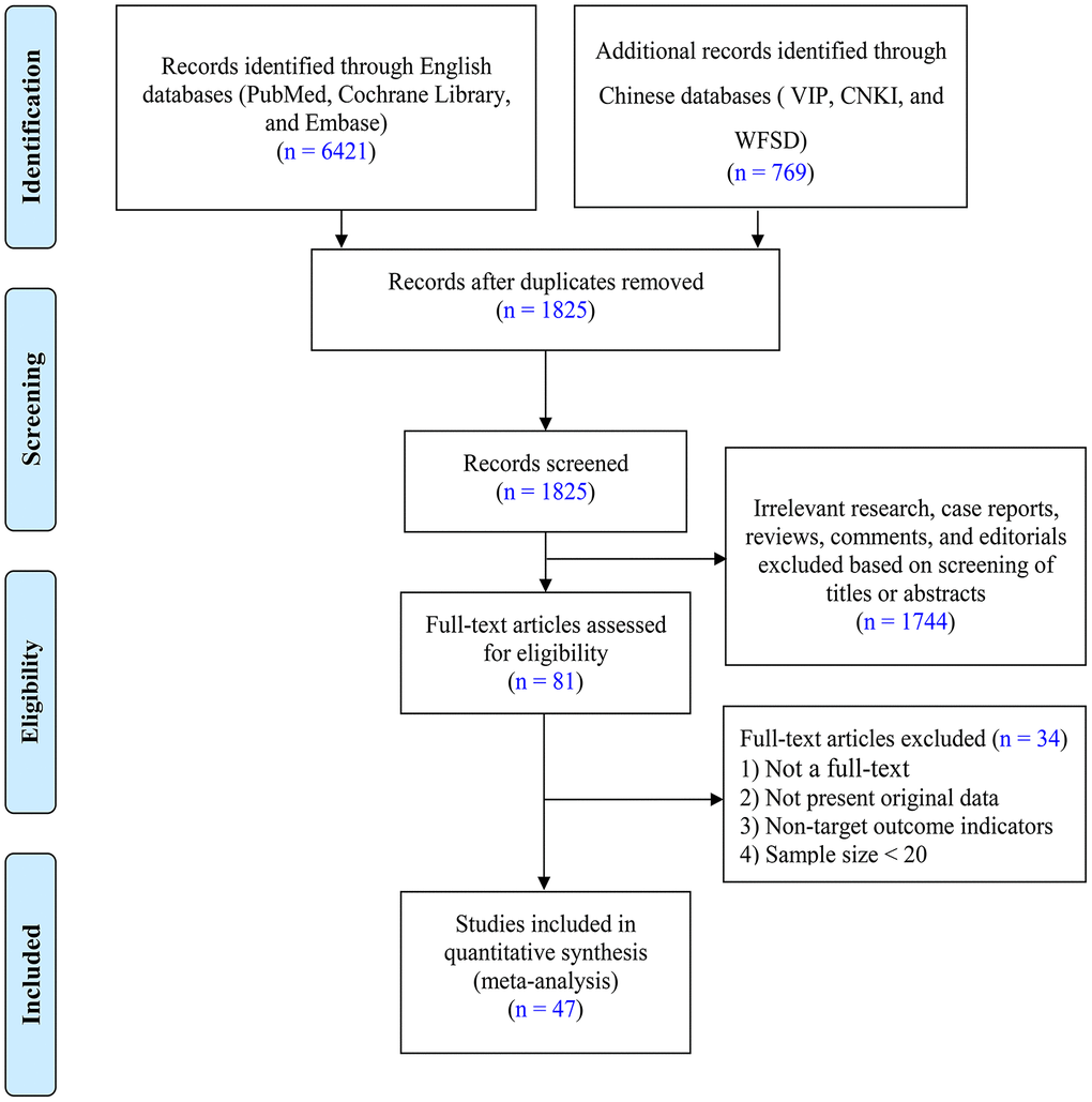 Using the retrieval strategy summarized in the Methods, a total of 7,190 related studies were evaluated, and 1825 papers remained after 5365 duplicate articles were excluded. After reading the titles and abstracts, 1744 studies that did not meet the inclusion criteria were excluded. After evaluating of the remaining 81 articles applicability by reading the full text, an additional 34 were ruled out based on the exclusion criteria. Ultimately, 47 studies [8–54], including 19 Chinese [8–26] and 28 English language [27–54] studies were included. The PRISMA flow diagram of the literature screening is shown in Figure 2. In addition, the quality assessment and baseline characteristics of the included articles are depicted in Table 1. The studies mainly reported the clinical characteristics of patients with COVID-19, incidences of underlying diseases, and prognoses. The participants in these studies mainly came from China, the United States, the United Kingdom, and Italy. The sample size distribution among these studies was roughly 21 to 5,700. Moreover, there were 3, 14, 10, 7, 7, and 5 studies with quality scores of 3, 4, 5, 6, 7, and 8, respectively. Thus, the literature included in our meta-analysis was of relatively high quality.