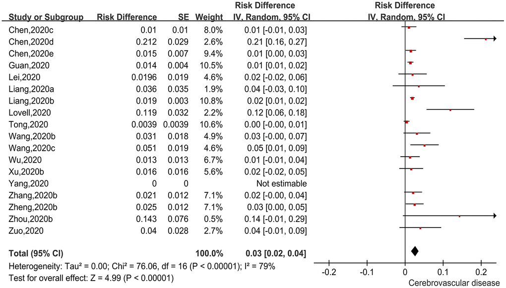 There were 18 studies [12–14, 17, 25, 27, 30, 32, 35, 36, 39–42, 44–47] reporting incidences of a history of cerebrovascular diseases among patients with COVID-19. We used a ratio difference (RD) as the effect size, and then applied generic inverse variance to calculate the pooled effect size. The pooled findings are shown in Figure 3. The heterogeneity test demonstrated moderate to significant heterogeneity among the studies (Chi2=76.06, I2=79%, P<0.00001), so the random-effects model was applied. The pooled incidence was 3.0% (95%CI=2.0%-4.0%, P<0.00001). The pooled finding indicated that 3.0% of COVID-19 patients had underlying cerebrovascular disease.