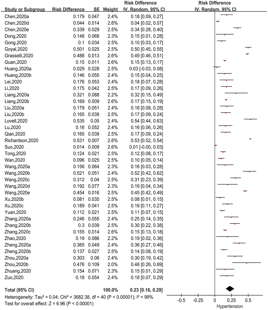Forty one [8–18, 21–26, 29–31, 33–46, 48–54] articles presented incidences of a history of hypertension in patients with COVID-19. Using RD as the effect size, we applied generic inverse variance to calculate the pooled effect size (Figure 4). We found that there was significant heterogeneity among the studies (Chi2=3682.38, I2=99%, P<0.00001), so the random-effects model was used. The pooled incidence was 23.0% (95%CI=16.0%-29.0%, P<0.00001), suggesting 23.0% of COVID-19 patients had a history of hypertension.