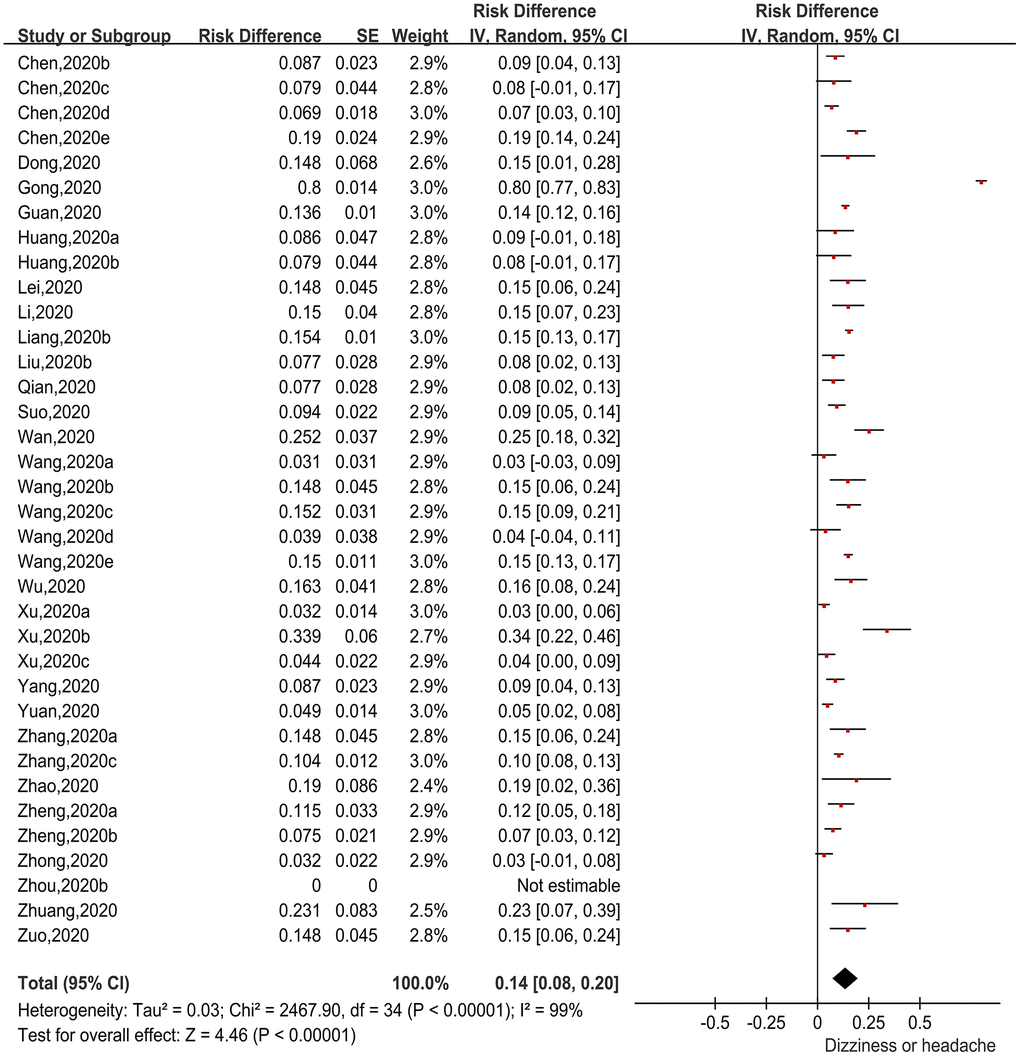 There were 36 papers [8–16, 18–21, 24, 26–28, 31, 32, 35–38, 40, 48, 51–54] reporting incidences of dizziness or headache (first symptom) in patients with COVID-19. Again using the RD as the effect size, generic inverse variance was applied to calculate the pooled effect size (Figure 5). The heterogeneity test indicated obvious heterogeneity among the studies (Chi2=2467.9, I2=99%, P<0.00001), so the random-effects model was applied. The pooled incidence was 14.0% (95%CI=8.0%-20.0%, P<0.00001). Thus, 14.0% of COVID-19 patients presented with dizziness or headache as their first symptom.