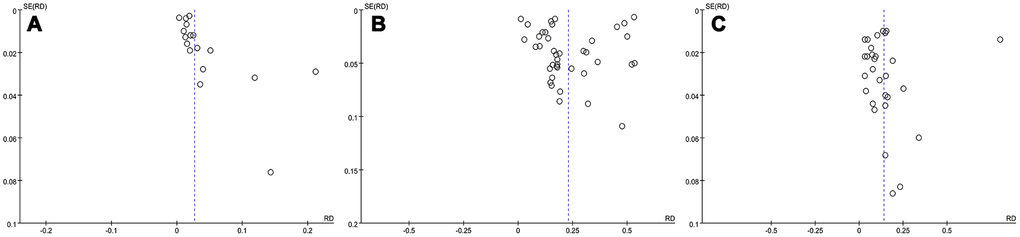 We evaluated the effect of each study on the pooled constituent ratio value by sequentially removing single studies. The results revealed no obvious change in stability, which validated the rationality and reliability of our meta-analysis. The funnel plot is depicted in Figure 6. Publication bias was rated as slight to moderate based on visualization of the funnel plot. We therefore cautiously suggest that the results of this study are relatively stable and reliable.