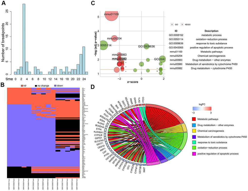 We used the Trendy R package to characterize dynamic gene-specific expression patterns over a time-course during acute liver injury [28]. In brief, Trendy fits a set of segmented regression models with varying numbers of breakpoints for each gene. Each breakpoint represents a dynamic change of gene expression over time. Genes with high R2 values were categorized as top dynamic genes. Then, the parameter estimates of the optimal model including the sign and p-value of the slope estimate were used to determine the direction (up, down, or no-change) of the changes in the expression of the top dynamic genes over time.