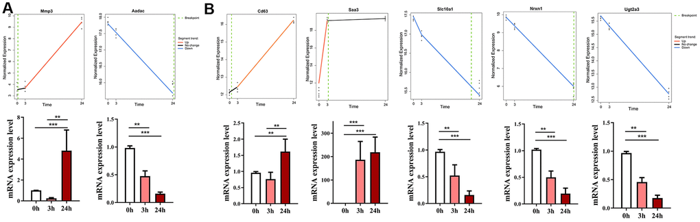 Next, we examined the gene expression of two candidate genes having the extreme breakpoints identified by Trendy, namely, matrix metallopeptidase 3 (Mmp3) and arylacetamide deacetylase (Aadac) in the liver tissues of ConA-induced hepatitis model mice. Trendy analysis showed that the expression of Mmp3 significantly increased at 3 h and peaked at 24 h in the livers of ConA-treated mice (Figure 2A). The mRNA expression of Aadac significantly decreased in the ConA-treated mice livers at 24 h post-ConA treatment (Figure 2A). Both Mmp3 and Aadac play significant roles in the liver functions [14]. Aadac is involved in lipolysis of cellular triacylglycerol stores and the assembly of very low-density lipoprotein (VLDL) [15]. The top 5 dynamic genes (Cd63, Saa3, Slc10a1, Nrxn1, Ugt2a3) differentially expressed in the ConA-treated mice livers were verified by qRT-PCR analysis (Figure 2B). These results confirm that significant changes in the expression of the top dynamic genes correlate with acute hepatitis in the ConA-induced hepatitis model mice.