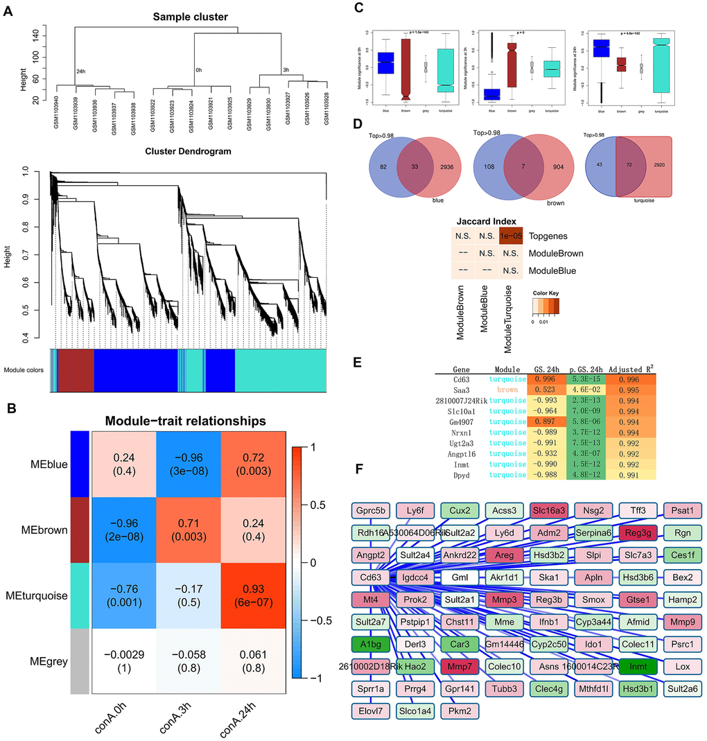 Weighted gene co-expression network analysis (WGCNA) was widely utilized to identify the hub genes of diseases. To determine if the top dynamic genes identified by Trendy could also be reproduced by the hub gene analysis, we first constructed gene coexpression networks of ConA-induced liver injury using global transcriptome. We identified the brown module with 910 genes and the turquoise module with 2992 genes as the top 2 modules (Figure 3A).