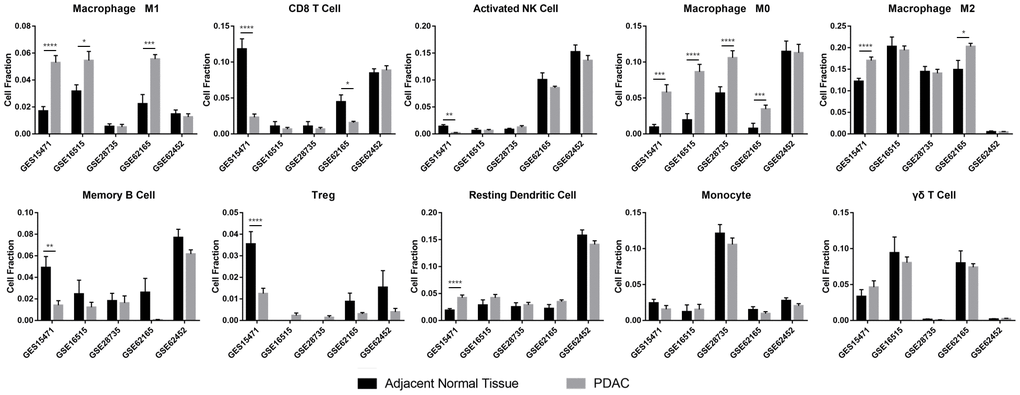 To unveil different characteristics between PDAC and normal tissues, we selected datasets based on three criteria: containing gene expression profile of both PDAC and non-tumor tissues; integrated and available gene expression profile of each dataset; a large sample size of each dataset as possible. As a result, GSE15471, GSE16515, GSE28735, GSE62165, and GSE62452 datasets were filtered and acquired from Gene Expression Omnibus (GEO) and were RMA normalized. With the help of the immune infiltration analysis tool CIBERSORT, the ratio of 22 immune cell types in five GEO datasets, including GSE15471, GSE16515, GSE28735, GSE62165 and, GSE62452, was acquired. Each dataset was divided into two groups according to their original experimental design, ANT and PDAC.