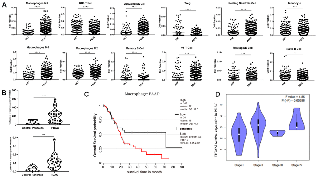 Taken together, these results suggest a substantial change in the TIME in PDAC relative to ANT, which indicates its crucial role in the development of PDAC. Moreover, M1, M2 and especially M0 macrophages may play an unexpected key role in PDAC, and, we found that macrophages are indeed involved in the prognosis of PDAC (Figure 2C). The expression of the macrophage marker ITGAM seemed positively correlated with PDAC progression (Figure 2D). Additionally, multivariate analysis of ITGAM low and high expression PDAC patients in TCGA (n = 176) showed ITGAM expression (p = 0.032) and survival status (p = 0.046) were significantly related with clinical stage, whereas gender (p = 0.323) and age (p = 0.662) were not significant (Supplementary Table 1).