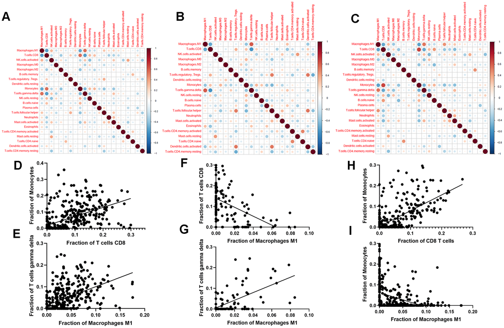 We next evaluated the correlations among different immune cell types in PDAC + ANT (Figure 3A), ANT (Figure 3B), and PDAC (Figure 3C), respectively. There were completely different correlations among different immune cell types. Specifically, monocytes had a positive correlation with CD8+ T cells (Figure 3D) and gamma delta T cells had a positive correlation with M1 macrophages (Figure 3E) in PDAC+ANT group. M1 macrophages had a positive correlation with gamma delta T cells (Figure 3G) but a negative correlation with CD8+ T cells (Figure 3F) in the ANT group. In addition, monocytes had a positive correlation with CD8+ T cells (Figure 3H) but a negative correlation with M1 macrophages in the PDAC group (Figure 3I). These results suggested that immune cells might interact with particular cell types to comprehensively influence the TIME in PDAC.