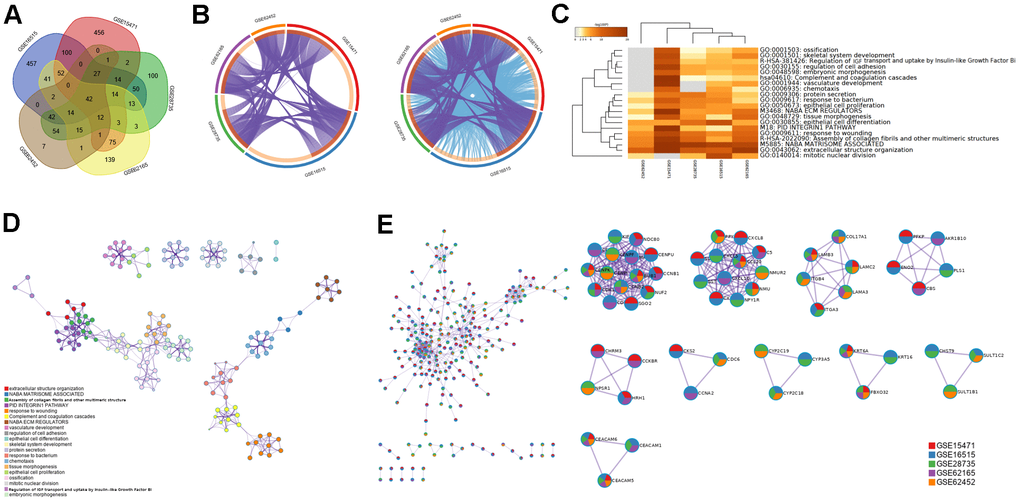 Pathway enrichment analysis of the key DEGs in our research was performed using Gene Ontology (GO) and Kyoto Encyclopedia of Genes and Genomes (KEGG) databases. The Metascape tool was used to find network relationships between DEGs (http://metascape.org/gp/index.html#/main/step1), while DEGs of GSE15471, GSE16515, GSE28735, GSE62165, and GSE62452 were uploaded.