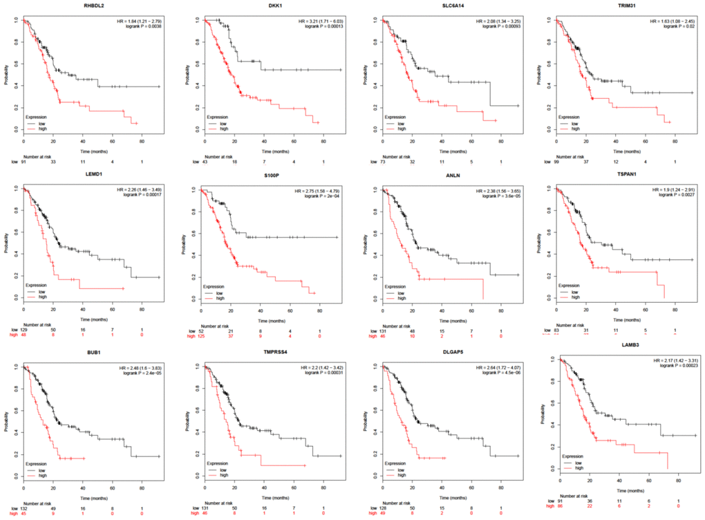 The majority of identified DEGs were effective in evaluating prognosis using the Kaplan-Meier plotter (Figure 5).