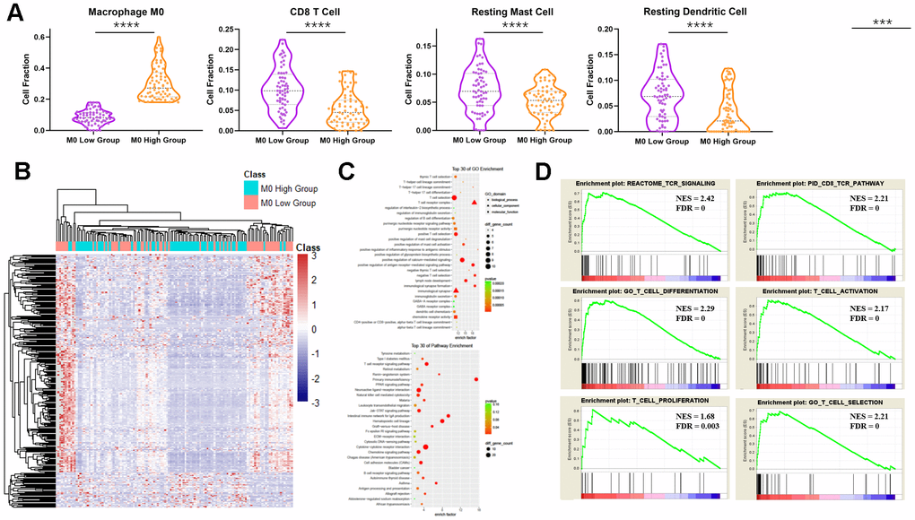 Subsequently, we considered the cause of TAM alteration, focusing on immature macrophages and M0 macrophages in PDAC. Macrophages in cancer have been reported to activate or inhibit T cells based on macrophage phenotype, costimulatory molecules, and cytokine secretion and can significantly alter T cell activation and effector function [35], findings that are identical to our results. Apart from T cell activation, our results show that the TCR signal, CD8 TCR, T cell differentiation, T cell proliferation, and T cell selection pathways are all enriched in PDAC patients with high numbers of M0 macrophages. Our work implies that TAMs may have more contact, directly or indirectly, with innate immunity and with T cell-mediated immunity. TAMs may affect tumorigenesis, proliferation, and metastasis by transforming the features of T cells, resulting in compensatory activity against tumors.