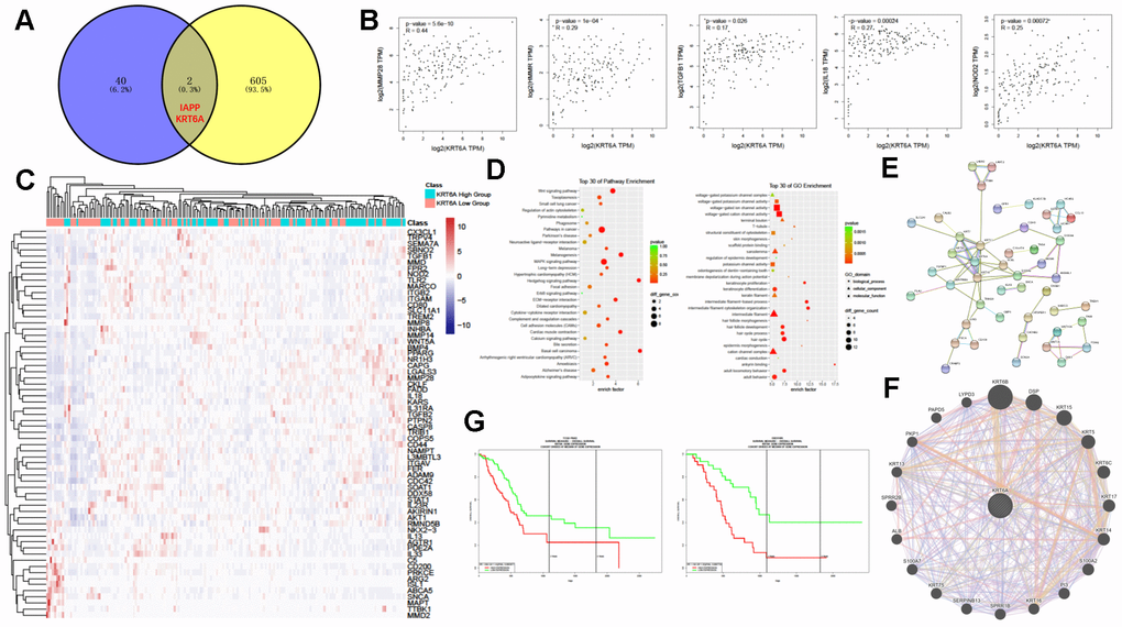 Next, we investigated the mechanism of TAM alteration in PDAC. We intersected the DEGs between the M0-low group and the M0-high group in TCGA and the DEGs between ANT and PDAC in the above 5 GEO datasets to find the potential mechanism that increases the fraction of macrophages in tumor other than normal tissues. The threshold of DEGs between the M0-low group and the M0-high group in TCGA is FC > 2 and p < 0.05. Therefore, we firstly filtered significant DEGs between PDAC and ANT groups, we then intersected these DEGs with DEGs between the M0-low group and the M0-high group to find potential genes regulating tumor-associated macrophages. Finally, two genes, IAPP and KRT6A, were obtained by intersecting the DEGs between the M0-low group and the M0-high group in TCGA and the DEGs between ANT and PDAC in the above 5 GEO datasets (Figure 7A). IAPP has been proven to play a role in the activation of macrophages through IL-1 [26], and inflammatory cascades are triggered by the uptake of IAPP aggregates by macrophages [27] in type 2 diabetes. However, the other gene, KRT6A, had not been reported to influence the frequency of TAMs. Consequently, our subsequent investigation focused on the particular mechanism by which KRT6A affected TAMs in PDAC.