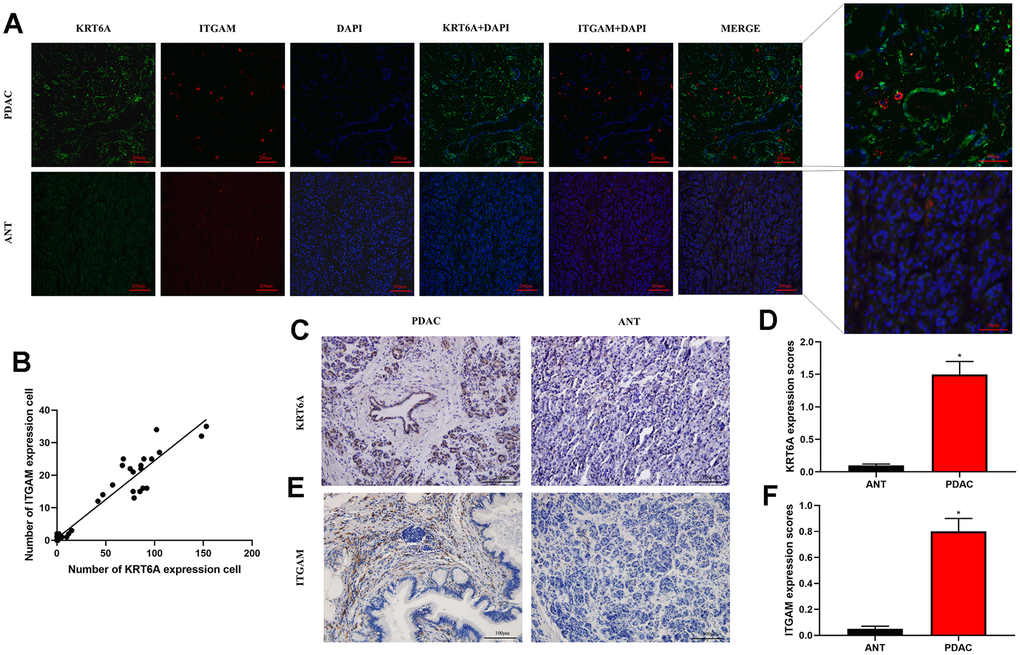 Paraffin sections of PDAC tissue and ANT tissue were used for IHC staining. Sections were stained with primary antibodies against KRT6A (1:200, Proteintech Group, Chicago, IL, USA) and ITGAM (1:200, Proteintech Group, Chicago, IL, USA) according to the product manual after routine steps. Phosphate-buffered saline (PBS) was used as a control.