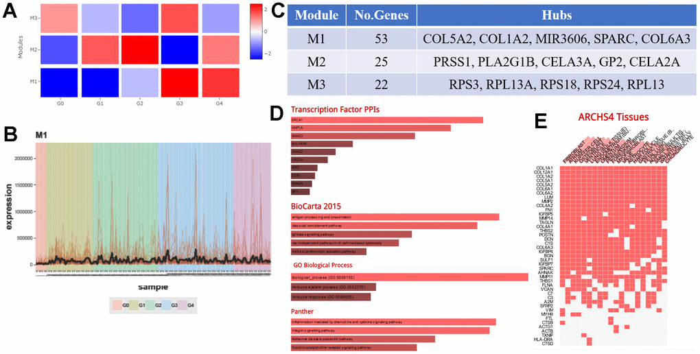 To identify genes the genes KRT6A targets to influence TAMs, we divided TCGA PAAD mRNA-seq data into five groups, Grade 0 (G0), Grade 1 (G1), Grade 2 (G2), Grade 3 (G3), and Grade 4 (G4), by the level of KRT6A expression, where G0 expressed the lowest amount of KRT6A (average RPKM = 0) and G4 expressed the highest amount of KRT6A (average RPKM = 193.24). CEMiTool illustrated those genes that were correlated with changes in KRT6A expression, which are potential key factors for regulating TAMs. The expression changes in one module of genes (Module 1) were perfectly consistent with KRT6A expression (Figure 9A, 9B). Major genes in Module 1 included COL5A2, COL1A2, MIR3606, SPARC, and COL6A3 (Figure 9C).