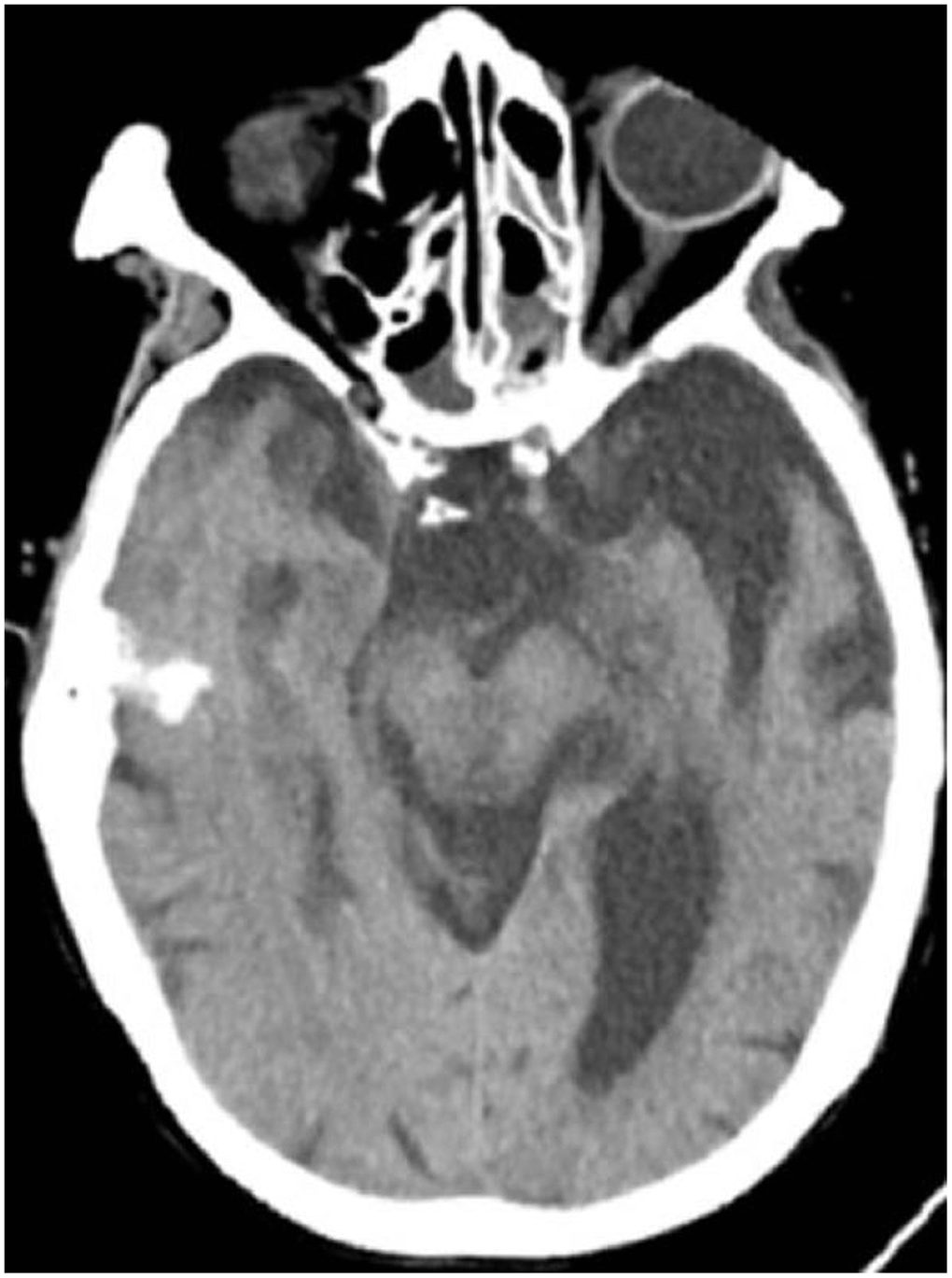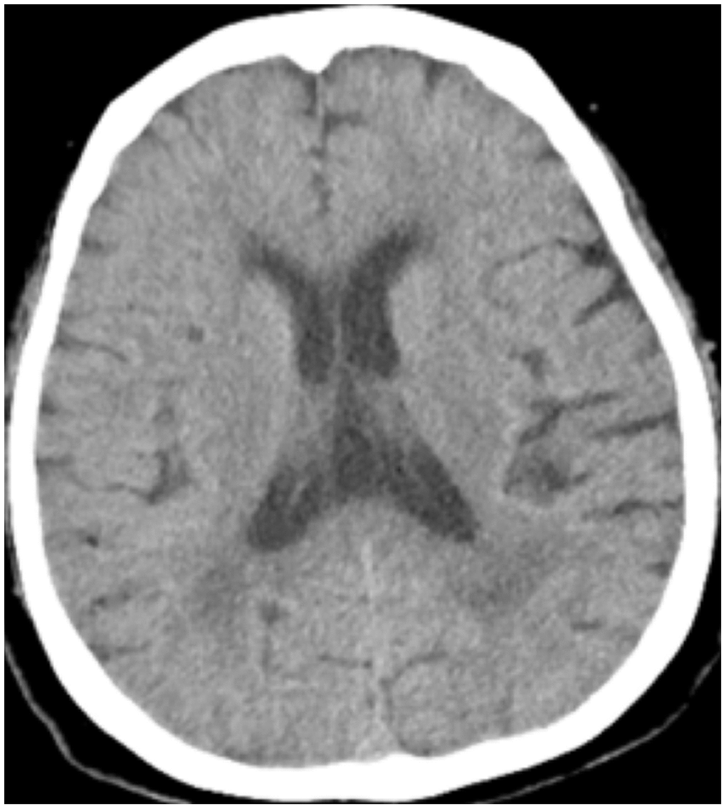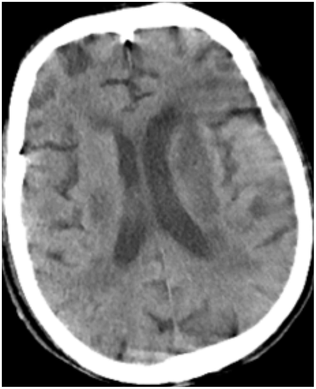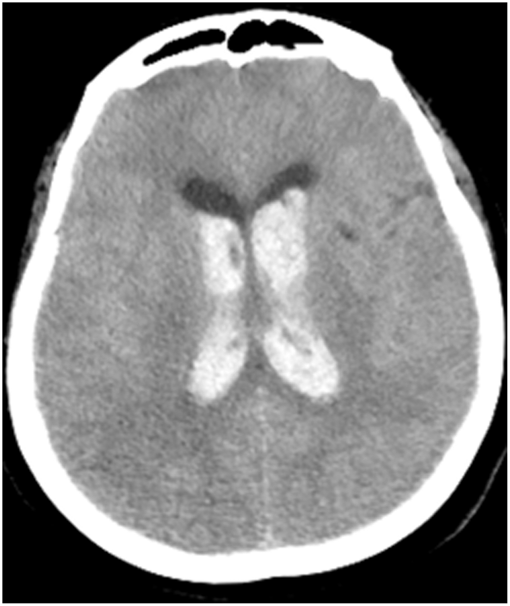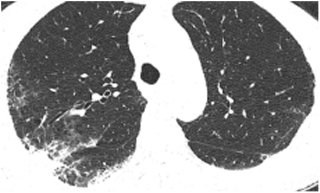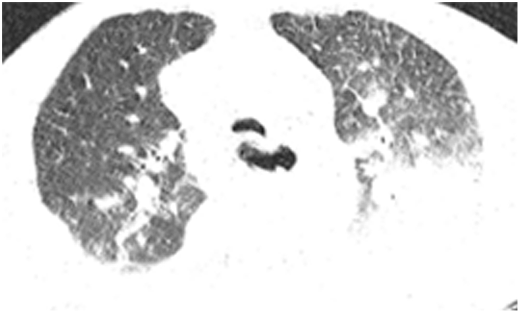 All patients were positive for the coronavirus nucleic acid test from pharyngeal swabs or blood. The blood lymphocyte counts and proportions of all patients were lower than normal (0.8×109/L) at the time of admission, and the white blood cell counts and proportions of six patients were higher than normal value (10×109/L). The blood D-dimer levels in all patients were higher than normal value (243 ng/mL) before neurological symptoms, and the C-reactive protein values in all patients were also higher than normal value (8000 μg/L). The chest CT of all patients showed flaky or frosted glass like- high-density shadow in lungs (Figures 1, 2), pleural effusion was seen in 2 cases (Figure 3), and no obvious abnormalities in 4 cases. The head CT imaging indicated that one patient had brainstem hemorrhage with ventricular cast and hydrocephalus (Figure 4), two patients had a large area of uniform low-density shadow on the frontotemporal lobe on the head CT (Figure 5), four patients had multiple flaky low-density shadow on the parietal lobe (Figure 6), one patient showed flaky low-density shadow in the pons (Figure 7), and three patients could see point-like low density shadow in basal ganglia (Figure 8).