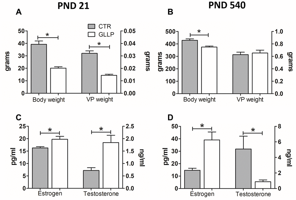 Figure 1. Body weight (A, B) and hormonal levels (C, D) of male offspring on PND 21 and 540. All data are expressed as mean±SD. Asterisks (*) represent statistical differences between experimental groups with p<0.05. CTR = control; GLLP = gestational and lactational low protein; PND = postnatal day; VP = ventral prostate.