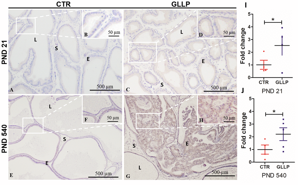 Based on the proteomic data (Supplementary File 1) and in silico analysis, we employed immunohistochemical and RT-qPCR analyses to validate the CALR as an upregulated target in the offspring VP born to dams fed with LPD in both PND 21 and 540. Immunostaining for CALR was more evident in the GLLP group on both PND 21 (Figure 10C and 10D) and PND 540 (Figure 10G, 10H) compared to the CTR group (Figure 10A, 10B, 10E, 10F) mainly in areas of carcinoma in situ. RT-qPCR confirmed the upregulation of CALR gene expression in the GLLP group at both ages (Figure 10I, 10J).