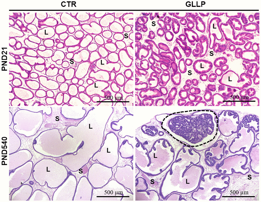 Figure 2. Representative histological sections of the VP lobes from the CTR and GLLP groups on PND 21 and 540, stained with hematoxylin-eosin (HE). Glandular growth in the GLLP group on PND 21 was impaired compared to the CTR. At PND 540, the carcinoma in situ was highlighted by the dashed circle. S = Stroma, L = Lumen, E = Epithelium, Scale bar: 500 μm.