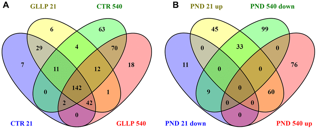 Figure 3. Venn diagram. (A) Shared proteins between CTR and GLLP groups in PND 21 and 540. (B) Shared proteins differentially expressed between the CTR and GLLP groups on PND 21 and 540. CTR = Control; GLLP = Gestational and lactational low protein; PND = Postnatal day; up = upregulated proteins; down = downregulated proteins.