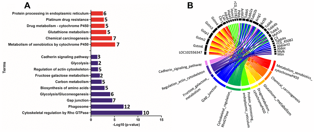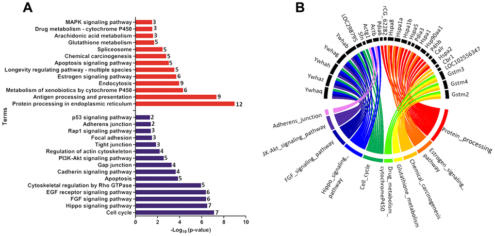 Functional enrichment was performed for the set of downregulated and upregulated proteins separately in both ages. The red and blue bars in Figure 4A demonstrate enriched terms for up and downregulated proteins on PND 21, respectively. Upregulated proteins enriched terms related to protein processing in the endoplasmic reticulum, antigen processing and presentation, metabolism of xenobiotics by cytochrome P450, endocytosis, estrogen signaling pathway, longevity regulating pathway - multiple species, apoptosis signaling pathway, chemical carcinogenesis, spliceosome, glutathione metabolism, arachidonic acid metabolism, drug metabolism - cytochrome P450, and MAPK (mitogen-activated protein kinase) signaling pathways. Downregulated proteins enriched terms related to cell cycle, Hippo signaling pathway, FGF (fibroblast growth factor) signaling pathway, EGF (epidermal growth factor) receptor signaling pathway, cytoskeletal regulation by Rho GTPase, apoptosis, cadherin signaling pathway, gap junction, phosphatidylinositol 3' -kinase (PI3K)-AKT signaling pathway, regulation of actin cytoskeleton, tight junction, focal adhesion, RAP1 (Ras-proximate-1) signaling pathway, adherents junction, and p53 signaling pathway. Using a circus plot analysis, we identified the set of deregulated proteins (up and down) associated with each enriched term on PND 21 (Figure 4B). On PND 540, the upregulated proteins enriched terms related to the metabolism of xenobiotics by cytochrome P450, chemical carcinogenesis, glutathione metabolism, drug metabolism - cytochrome P450, platinum drug resistance, and protein processing in the endoplasmic reticulum. Downregulated protein-enriched terms related to cytoskeletal regulation by Rho-GTPase, phagosome, gap junction, glycolysis/gluconeogenesis, biosynthesis of amino acids, carbon metabolism, fructose galactose metabolism, regulation of actin cytoskeleton, glycolysis, and cadherin signaling pathway (Figure 5A). Using a circus plot analysis, we identified the set of deregulated proteins (up and down) associated with each enriched term on PND 540 (Figure 5B). The list of proteins that enriched each molecular term is described in Supplementary File 2.