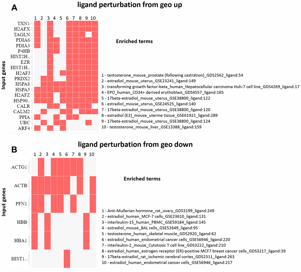 Figure 6. (A) Clustergram generated by Enrichr using upregulated proteins on PND 21. The red cells in the matrix indicate the genes associated with each term. It was demonstrated the top 10 enriched terms with p-value <0.05. (B) Clustergram generated by Enrichr using downregulated proteins on PND 21. The red cells in the matrix indicate the genes associated with each term. It was demonstrated the enriched terms with p-value <0.05 (top 10).