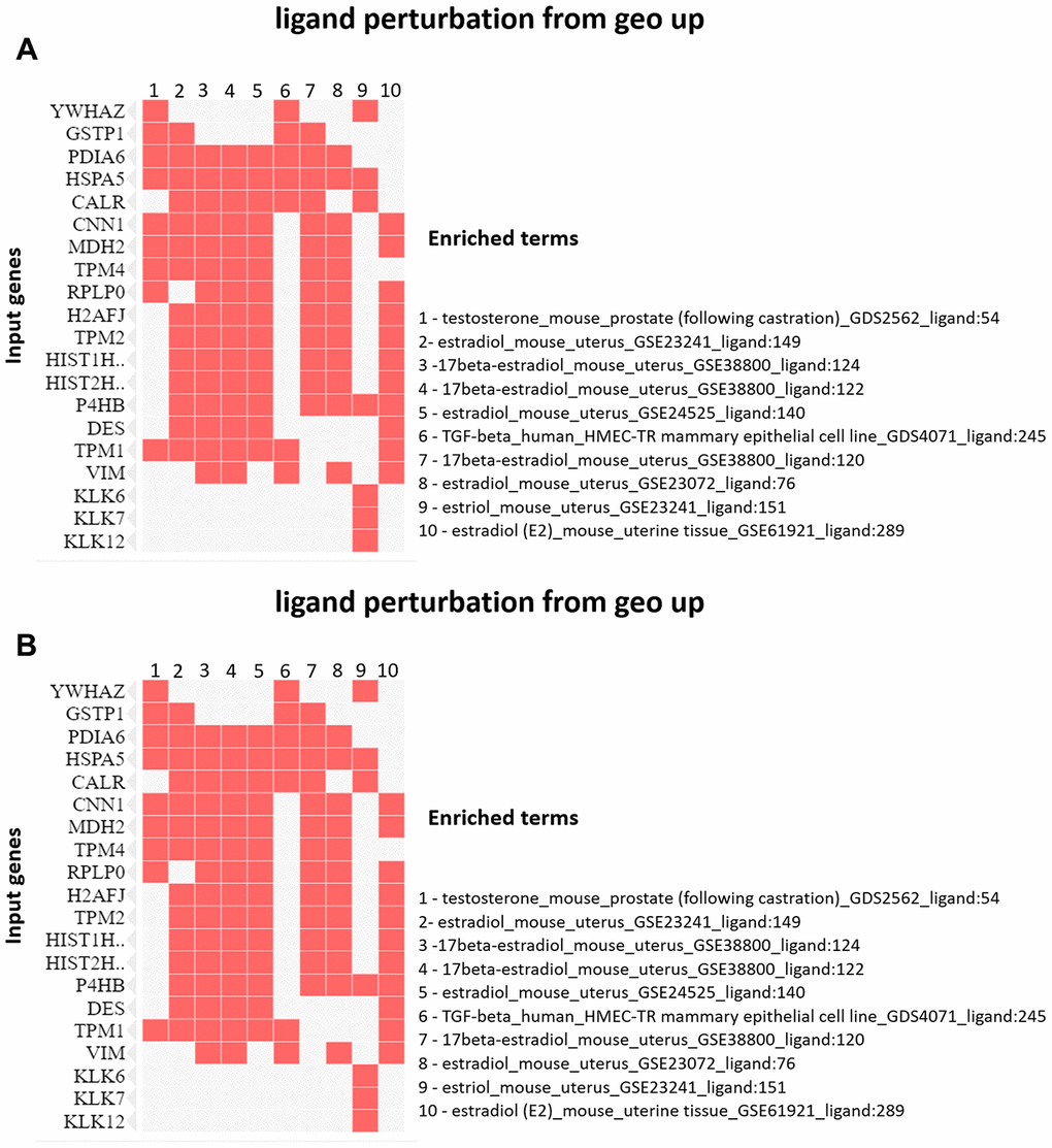 The enrichment analysis from Ligand Perturbation UP/DOWN database showed that upregulated proteins (in both PND 21 and 540) are associated with hormonal treatment, especially testosterone and estrogen (Figure 6A, 6B). The set of downregulated proteins for both ages also enriched terms related to exposure to testosterone and estrogen (Figure 7A, 7B). Overall, these results highlighted the involvement of a hormonal imbalance on maternal LPD-induced prostate disorders in offspring.