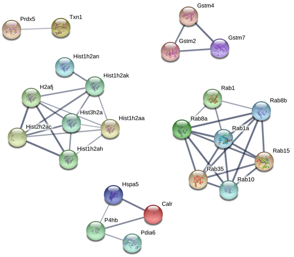 Protein-Protein interaction (PPI) network analysis demonstrated several clusters for up and downregulated proteins on PND 21 and 540 (Supplementary Figures 1–4). Based on these results, we identified five principal clusters commonly deregulated in both ages: (1) RAB (Ras-related protein) 1, RAB10, RAB15, RAB1A, RAB35, RAB8A, AND RAB8B; (2) H2AFJ (Histone H2A.J), HIST1H2AA, HIST1H2AH, HIST1H2AK, HIST1H2AN, HIST2H2AC, and HIST3H2A; (3) GSTM2 (glutathione S-transferase Mu 2), GSTM4 and GSTM7; (4) CALR (calreticulin), HSPA5 (heat shock protein family A member 5), P4HB (protein disulfide isomerase-4), PDIA6 (Protein Disulfide Isomerase Family A Member 6); (5) PRDX5 (peroxiredoxin-5) and TXN1 (thioredoxin 1). The cluster identified in commonly downregulated proteins on PND 21 and 540 was composed of HBA1 (hemoglobin Subunit Alpha 1), HBA-A2, HBB, and HBE1 (Figure 8).