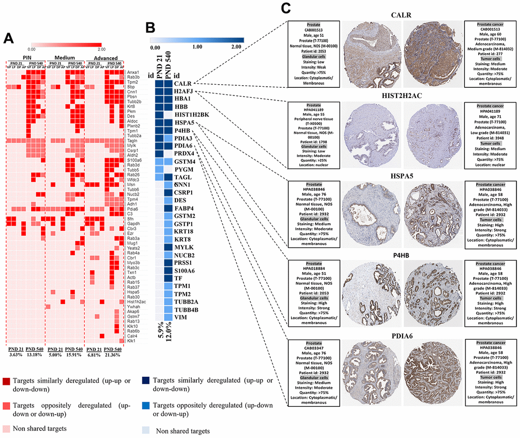 Figure 9. (A) Heatmap showing the commonly differentially targets from our set of DEP and RNA-seq data from ventral, dorsal, lateral, and anterior prostate lobes in the mice model of PCa (PB-Cre/PtenloxP/loxP). The percentage of commonly deregulated targets increases as the prostatic disorders worsen (PIN to Medium to Advanced PCa). (B) The commonly deregulated targets between our DEP and those extracted from RNA-seq data by GEPIA. The percentage of commonly deregulated targets increases in the prostate of older offspring. (C) Immunostaining of normal and prostate tumor samples for five commonly upregulated targets in our samples and GEPIA database (http://gepia.cancerpku.cn/) using immunohistochemical data available at the Human Protein Atlas database (https://proteinatlas.org/). PND: Postnatal day; VP: Ventral prostate; LP: Lateral prostate; DP: Dorsal prostate; AP: Anterior prostate PIN: Prostate intraepithelial neoplasia; PCa: Prostate cancer.