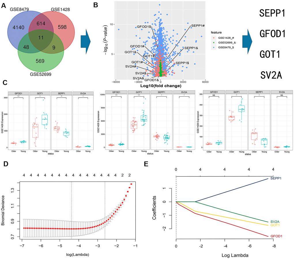 LASSO regression model was used to select 4 key differentially expressed (SEPP1, GFOD1, GOT1, and SV2A) mRNAs (DEMs) predictors of sarcopenia risk and the lasso parameter (lambda.min) was 0.01038519 (Figure 1D, 1E). The main purpose of using LASSO regression in this study is to prevent the overfitting problem. At the same time, the LASSO regression directly reduces some unnecessary parameters to zero during parameter reduction, further simplifying our model. Thus, this method provides more scientific results. Interestingly, the results of LASSO regression in this study reveals that the four characteristic factors (SEPP1, GOT1, GOFD1, and SV2A) have an important role in the prediction of sarcopenia. Accordingly, these four characteristic factors have not been screened out.