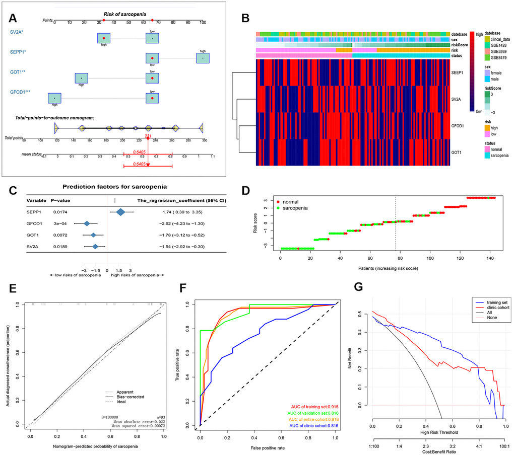 After that, a nomogram model containing the independent predictors is shown in Figure 2A, 2C as well as Supplementary Table 1. In the training cohort, the area under the ROC curve (AUC) was high at 0.915 (Figure 2E, 2F). We also added our clinical data to corroborate our results in Figure 2F and the clinical cohort had an AUC of 0.770. These findings suggested that the nomogram can be used to predict the occurrence of sarcopenia. The C index of the proposed Nomogram was 0.915 (95% CI, 0.840-0.989) which was lower than the validation set 0.945 (95% CI, 0.869-1.000) and higher than the clinical cohort 0.770 (95% CI,0.642-0.897) (Table 1). Besides, we also described accuracy, F-value, precision and recall of each dataset and proposed nomogram in Table 2. These findings suggested a strong discriminatory power and accurate predictive performance. The decision curve analysis of the nomogram is shown in Figure 2G. Therefore, the nomogram is a predictive model in clinical practice that can be used to predict the occurrence of sarcopenia for early and timely intervention. The heat map and risk plot generated for the DEMs and predicted risk score for sarcopenia from the two groups are presented in Figure 2B, 2D.