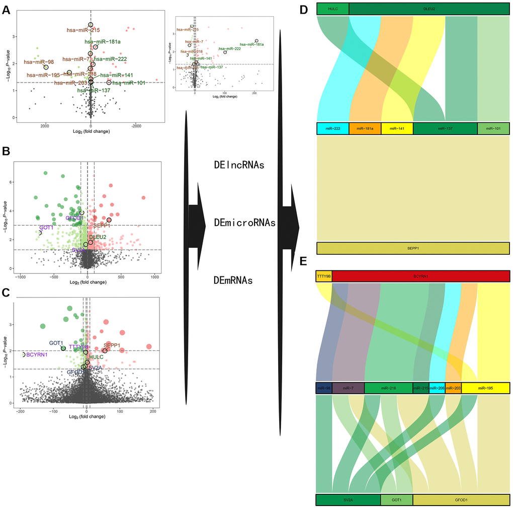Differentially expressed lncRNAs (DE-lncRNAs) and miRNAs (DE-miRNAs) were obtained by differential expression analysis as previously described. Volcano plots of differential expression are presented in Figure 3A–3C. Construction of a ceRNA network was based on miRcode, miRWalk3.0 and miRTarBase databases as shown in Figure 3D, 3E. Two DE-lncRNAs (TTTY9B and BCYRN1) and five DE-miRNAs (miR-222, miR-181a, miR-141, miR-137, and miR-101) were found to be down-regulated, while two DE-lncRNAs (DLEU2 and HULC) and seven DE-miRNAs (miR-98, miR-7, miR-218, miR-215, miR-206, miR-203, and miR-195) were found to be up-regulated in the sarcopenia group. Combined with the nomogram prediction model results, SEPP1, GFOD1, GOT1, and SV2A may be key modulators of sarcopenia.