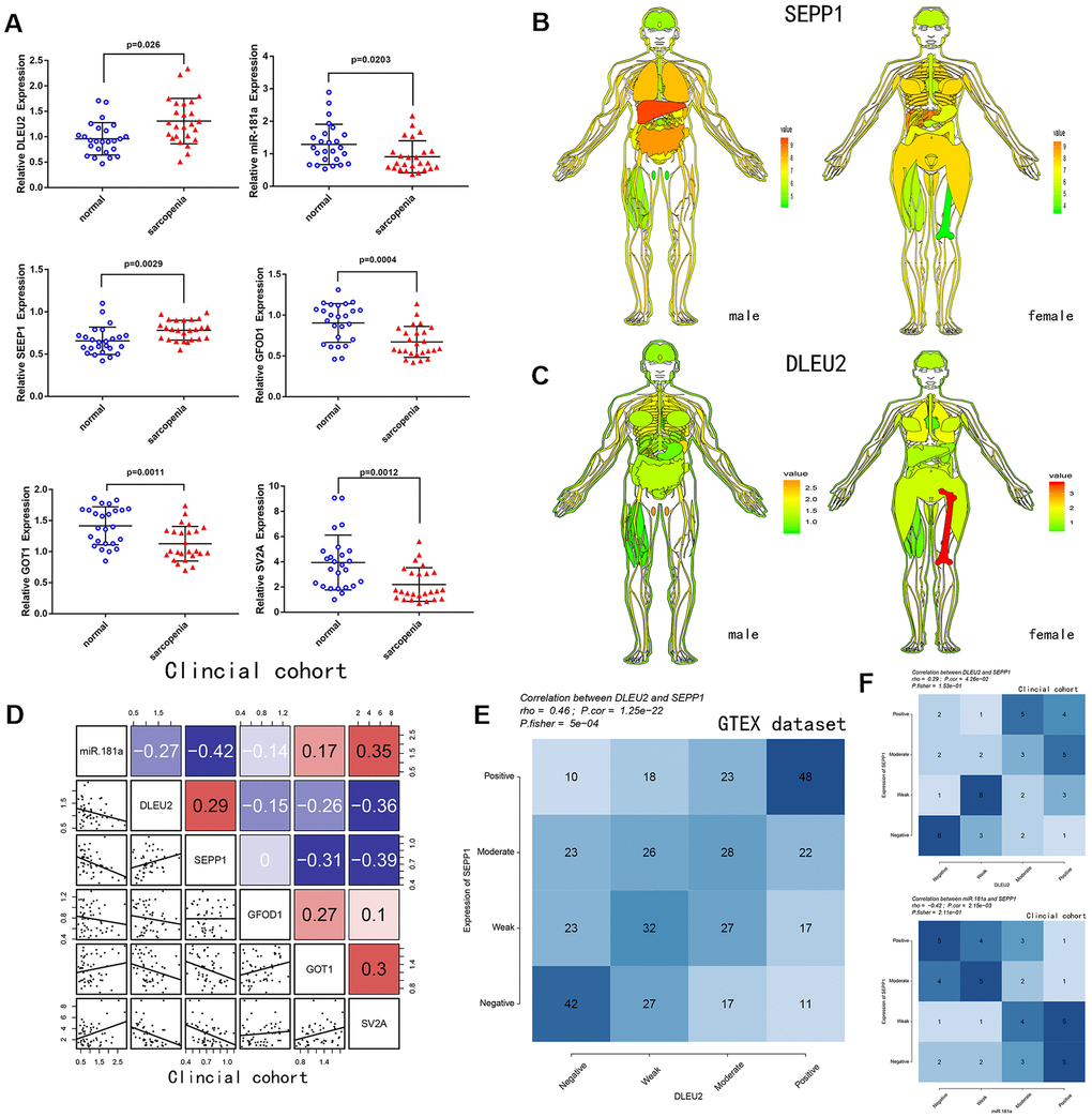 Correlation and ceRNA network (Figure 3D, 3E) analysis revealed that lncRNA DLEU2 acts as a sponge of miR-181a and up-regulates the expression of SEPP1. Further, in the clinic cohort, correlation analysis showed a significant negative correlation between miR-181a with SEPP1 and DLEU2 (Figure 4D). Besides, there was a significant positive correlation between SEPP1 with DLEU2 both in the GTEX database and clinic cohort (Figure 4E, 4F). To further understand the expression of SEPP1 and DLEU2, human tissue–enriched protein expression maps were constructed. SEPP1 and DLEU2 were found to be lowly enriched in the muscle (Figure 4B, 4C). Therefore, this study revealed that miR-181a could be a protective factor, whereas DLEU2 and SEPP1 could be detrimental to skeletal muscle development.