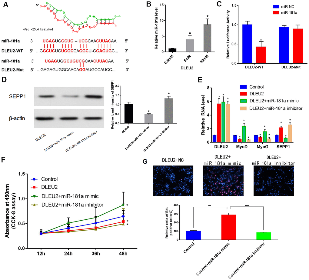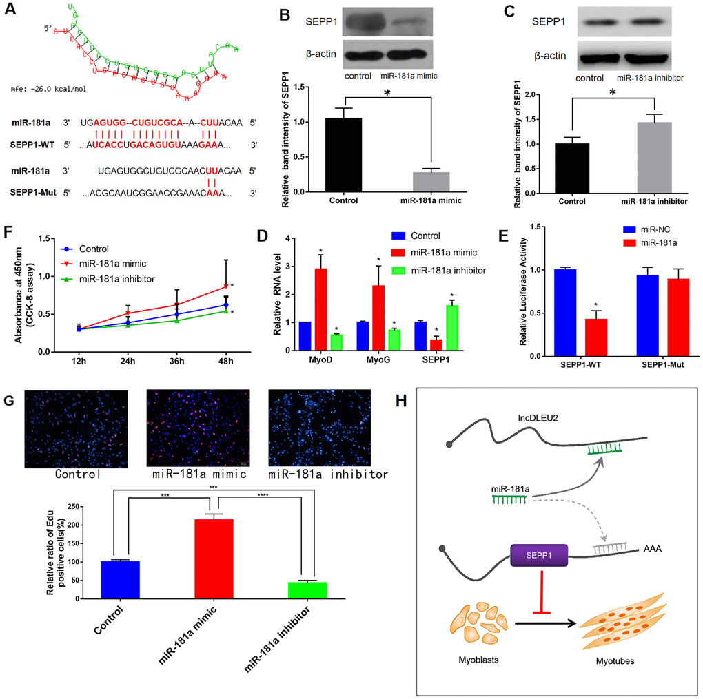 MiRWalk and miRcode databases predicted that miR-181a regulated SEPP1 expression (Figure 8A). Luciferase reporter assays revealed that C2C12 cells co-transfected with SEPP1-WT and miR-181a showed lower luciferase activity compared to those co-transfected with SEPP1-WT and microRNA-negative control (NC; p < 0.05) (Figure 8D). Besides, forced expression of miR-181a in C2C12 cells down-regulates SPEE1 protein expression, while miR-181a inhibitor up-regulates SPEE1 expression (Figure 8B, 8C, 8E). Cells treated with the miR-181a mimic exhibited significantly higher proliferation compared with the others (Figure 8F). These results indicated that miR-181a is a key regulator of SEPP1 expression in muscle. In conclusion, lncRNA DLEU2 acts as a miR-181a sponge to regulate the expression of SEPP1, thereby promoting muscle proliferation and differentiation. (Figure 8H).