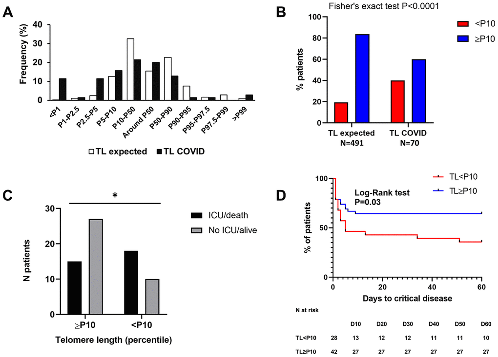 Our primary objectives were to measure telomere length in hospitalized COVID-19 patients and compare it to nomograms from our reference population and to study the potential association between short telomeres (below tenth percentile -P10) and unfavorable COVID-19 outcome, defined as admission in ICU and/or death without ICU (critical disease, according to the definition of NIH, covid19treatmentguidelines.nih.gov/overview/management-of-covid-19/). Our secondary objectives were to correlate TL to baseline (at the day of admission in hospital) biological and radiological features. Finally, we sought to detect signs of senescence in lung samples from deceased COVID-19 patients.