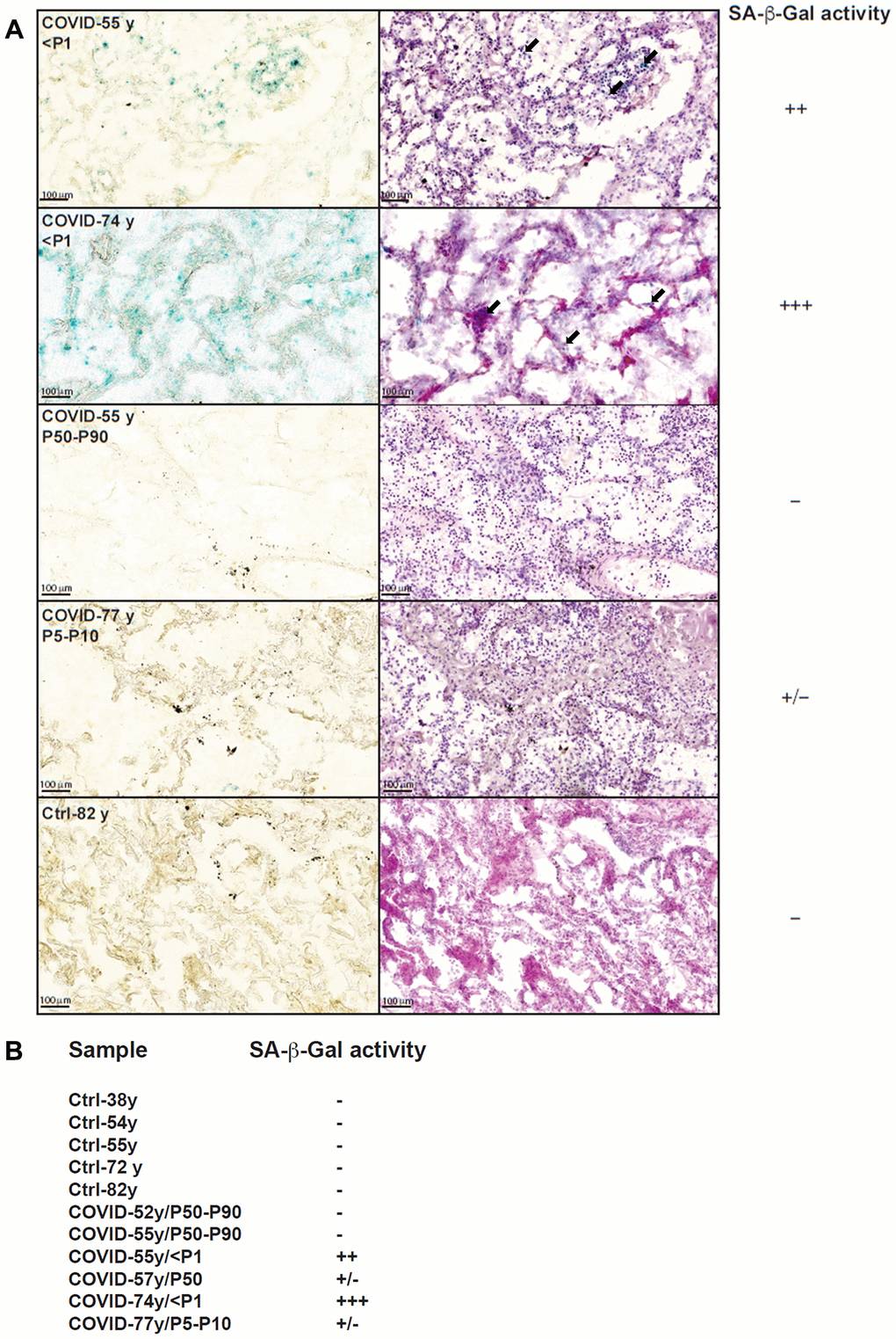 We had access to autopsy lung tissue from COVID-19 deceased patients and control lung tissue from our local biobank (IREC-PNEU). We slightly adapted the protocol previously described to perform senescence-associated β-galactosidase (SA-β-Gal) [28]. Briefly, after fixation with 0.2% formaldehyde for 10 min, 16 μm-thick sections of snap-frozen lung tissues were rinsed with PBS before overnight incubation at 37° C in staining solution at pH 5.6. After scanning, slides were incubated overnight in PBS 1x at RT, rinsed with ddH20 and stained first with hematoxylin and then with eosin. After a new rinsing with water, tissues were dehydrated through a series of ethanol baths, from 30% to 100%, before incubation in isopropanol and then xylene and, finally, mounting.