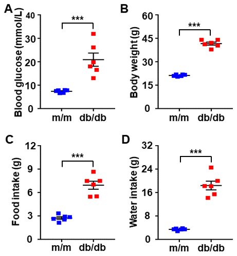We adopted db/db mice as a T2DM mouse model and m/m mice as control subjects. Metabolic parameters, including blood glucose, body weight, and food and water intake, between the db/db and m/m mice were evaluated after 1 week of acclimation. Fasting blood glucose, body weight as well as food and fluid intake were significantly increased in db/db mice than those of m/m mice (Figure 1A–1D).