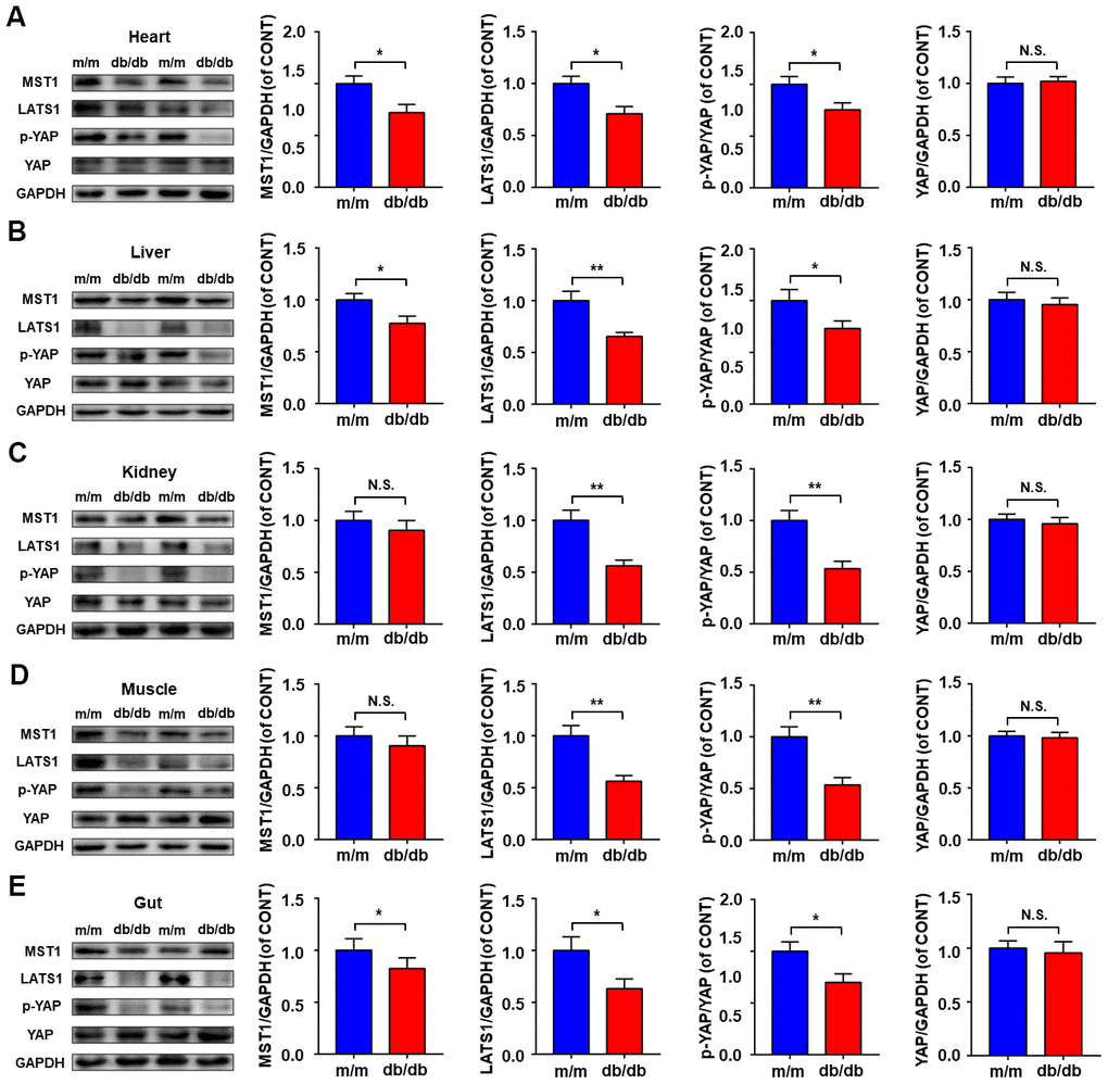 Expressions of Hippo signaling, consisting of MST1, LATS1, p-YAP, and YAP were determined in selected peripheral tissues between db/db and m/m mice (Figure 2A–2E). Compared to m/m mice, db/db mice showed a significant decrease in MST1, LATS1, and p-YAP/YAP ratio in the heart, liver, and gut (Figure 2A, 2B, 2E). Although the MST1 level in kidney and muscle tissues failed to show a significant change between db/db and m/m mice, the LATS1 levels and p-YAP/YAP ratio in db/db mice were significantly lower than those in m/m mice (Figure 2C, 2D).