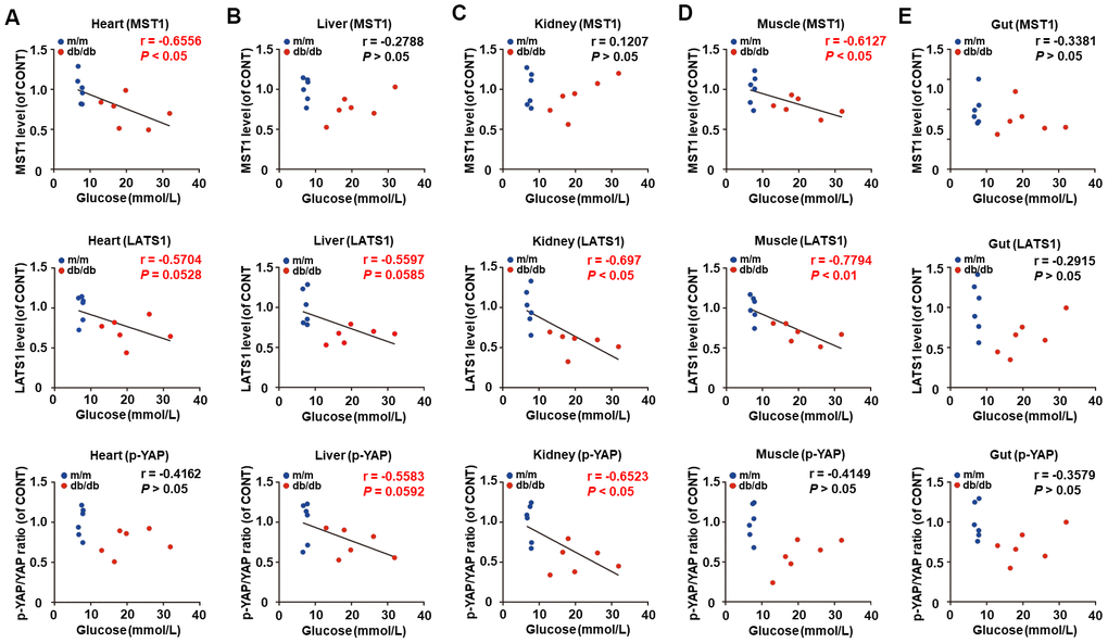 Considering the pivotal role of fasting blood glucose in the progression of T2DM, correlations between fasting blood glucose and Hippo signaling levels were analyzed (Figure 3A–3E). Intriguingly, there were significant negative correlations between fasting blood glucose and MST1 and LATS1 levels in the heart and muscle (Figure 3A, 3D), as well as LATS1 levels and p-YAP/YAP ratio in the liver and kidney (Figure 3B, 3C). However, there was no significant correlation between fasting blood glucose and Hippo signaling levels in the gut (Figure 3E).