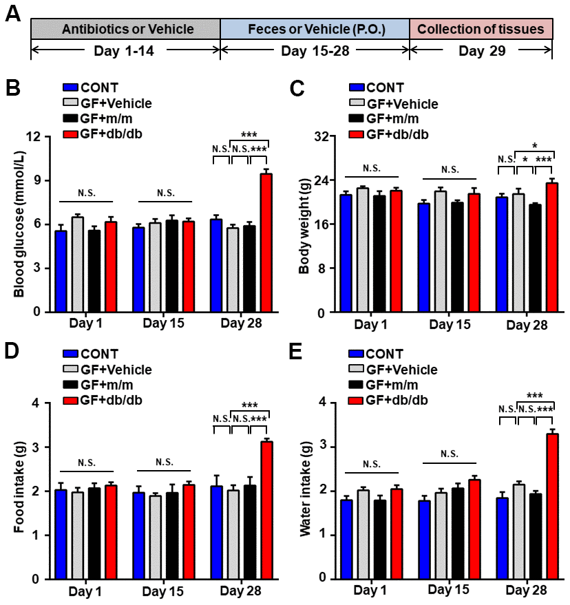 After the establishment of pseudo germ-free mice, fecal transplantation were conducted from db/db and m/m mice (Figure 4A). Then, metabolic parameters were measured on day 28 as reported previously [20]. Obviously, as compared to m/m or vehicle group, fasting glycemia, body weight, food and fluid intake were significantly elevated in db/db group. However, there were no dramatic alterations among four groups on day 1 and 15 (Figure 4B–4E).