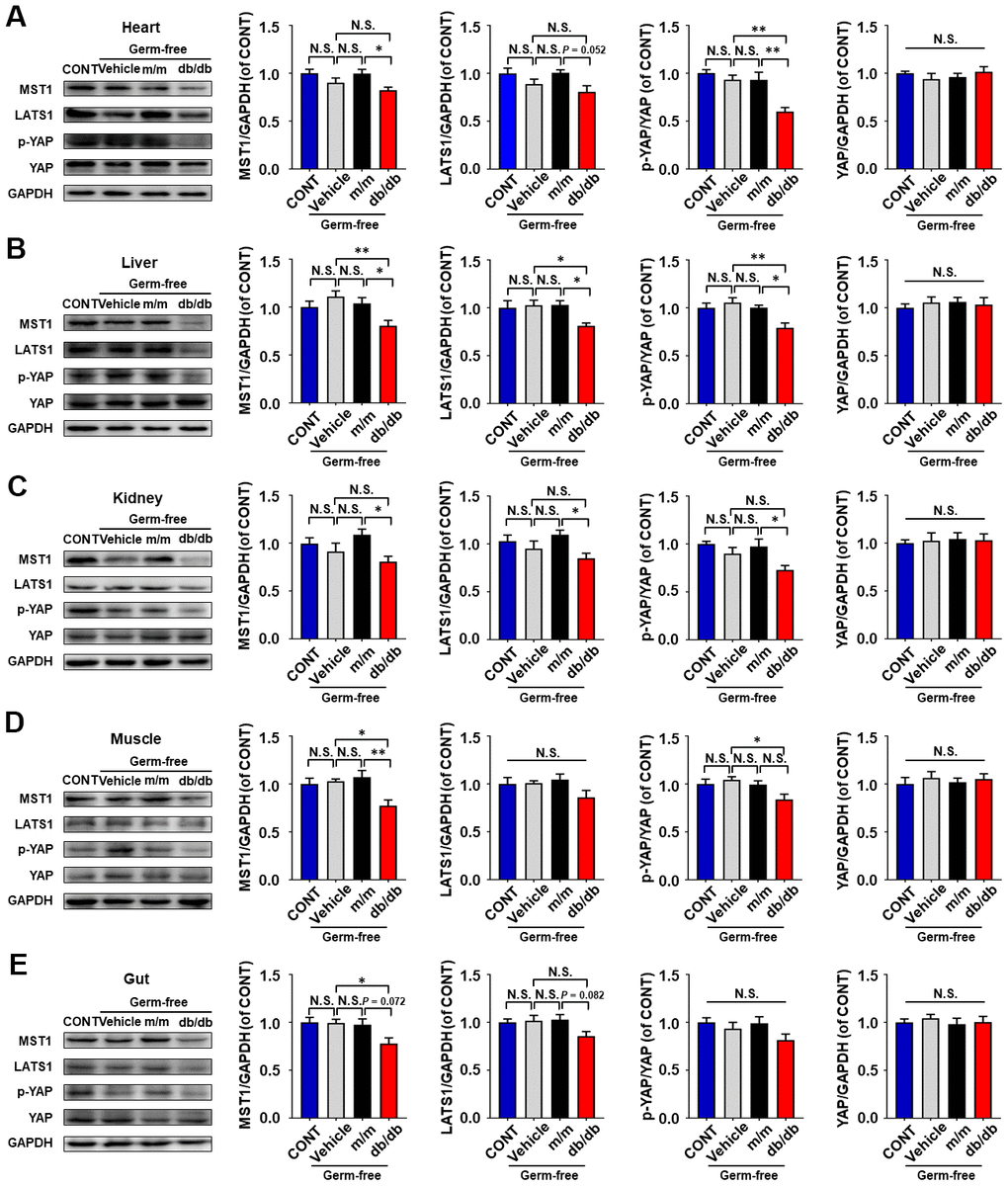 After fecal transplantation, MST1 and LATS1 levels, and p-YAP/YAP ratio in selected peripheral tissues were determined by Western blot in pseudo germ-free mice (Figure 5A–5E). Intriguingly, a significant decrease in these values was observed in the liver tissue of db/db mice compared with values in the vehicle or m/m group (Figure 5B). MST1 levels and p-YAP/YAP ratio were significantly decreased, and there was a slight decrease in LATS1 level in the hearts of the db/db group compared to values in the m/m group (Figure 5A). Regarding kidney tissue, a significant decrease was identified in the MST1 and LATS1 levels, and p-YAP/YAP ratio in the db/db group compared to those in m/m group (Figure 5C). Additionally, the MST1 level and p-YAP/YAP ratio in muscle of the db/db group showed a significant decrease compared to those in the vehicle group, whereas no significant difference was detected in LATS1 level among the four groups (Figure 5D). Although the MST1 level was significantly lower in the gut of the db/db than in the vehicle groups, there was no statistical difference in MST1 and LATS1 levels, and p-YAP/YAP ratio between the db/db and m/m groups (Figure 5E). However, Hippo signaling expression in all selected peripheral tissues failed to show a significant alteration among the control, vehicle, and m/m groups (Figure 5A–5E).