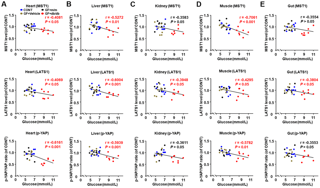 A significant correlation was noted between fasting blood glucose and MST1, LATS1 levels, and p-YAP/YAP ratio in the heart, liver, and muscle tissues, as analyzed in selected peripheral tissues after fecal transplantation from db/db and m/m mice into pseudo germ-free mice (Figure 6A, 6B, 6D). A significant negative correlation was found between fasting blood glucose and LATS1 levels in the kidney and gut. However, there were no significant correlations between fasting blood glucose and MST1 level and p-YAP/YAP ratio (Figure 6C, 6E).