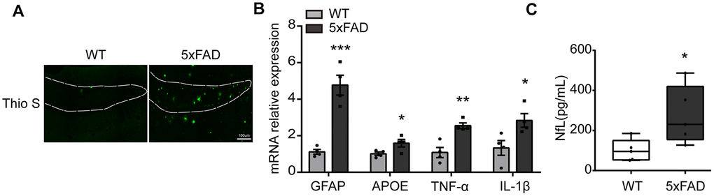 To evaluate the level of inflammatory molecules in the whole hippocampus of 6-month 5xFAD mouse the amyloid plaques, associated risk factors (IL-1β, TNF-α, APOE, GFAP) and neurofilament light chain (NfL) were examined. As shown in Figure 1A, massive Aβ plaques were obviously observed in the hippocampus (DG) in 5xFAD compared to Wide Type (WT) group. qPCR results showed that the expression of apolipoprotein E (APOE), GFAP, IL-1β and TNF-α was significantly increased in 5xFAD mice (Figure 1B). The serum NfL, a marker of AD, was also prominently upregulated (Figure 1C). All the results showed that inflammatory response was increased in the hippocampus of 5xFAD mice, compared to WT mice [12, 30].