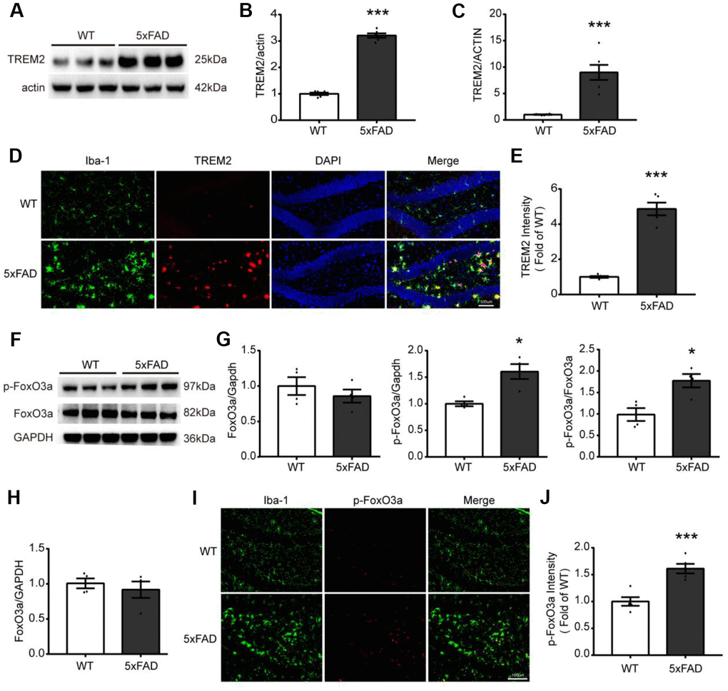 For investigating the relations between TREM2 and/or FoxO3a in AD pathology, first, the TREM2 level was examined by qPCR and western blot in whole hippocampus, in which the mRNA and protein level of TREM2 were significantly increased in the hippocampus in 5xFAD than WT (Figure 2A–2C). Additionally, the brain sections from WT and 5xFAD mice were also examined by confocal microscopy for colocalization of TREM2 and microglia marker Iba-1 (myeloid cell marker ionized calcium-binding adapter molecule 1). The results showed that the TREM2 was significantly upregulated and overlapped with Iba-1 surrounding the amyloid plaques, and that more amoeboid phenotype (activated) microglia in the DG area of hippocampus in 5xFAD mice (Figure 2D, 2E). These results revealed the TREM2 was mainly expressed on amoeboid microglia and was upregulated in 5xFAD mice. The mRNA and protein levels of FoxO3a were also examined (Figure 2F–2H), there is no difference in total protein or mRNA levels of FoxO3a between WT and 5xFAD mice (Figure 2G, 2H). Interestingly, the phosphorylation of FoxO3a (p-FoxO3a) was significantly increased in hippocampus in 5xFAD mice. We also examined where the p-FoxO3a locates in microglia by co-staining brain sections targeting their specific markers (p-FoxO3a and Iba-1), the results showed that more p-FoxO3a colocalized with Iba-1 in 5xFAD mice compared to WT mice (Figure 2I, 2J).